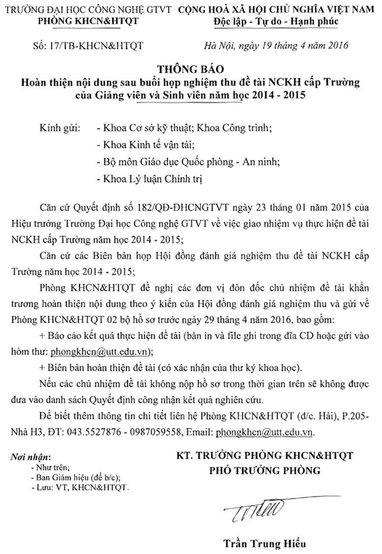 Thông báo Hoàn thiện nội dung sau buổi họp nghiệm thu đề tài NCKH cấp Trường của Giảng viên và Sinh viên năm học 2014 - 2015 21/04/2016 16:04