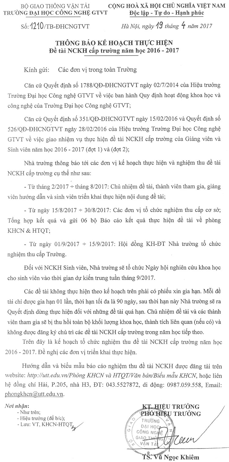 Thông báo Kế hoạch thực hiện đề tài NCKH cấp trường năm 2016 - 2017