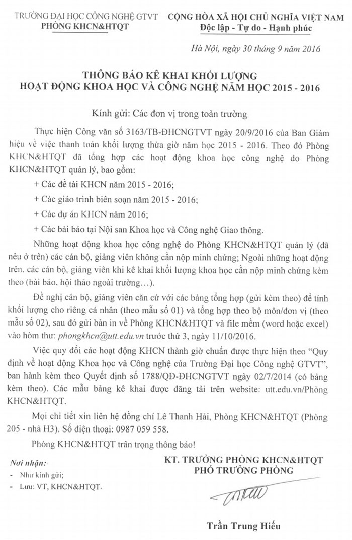 Thông báo kê khai khối lượng hoạt động KH&CN năm học 2015-2016 07/10/2016 15:10 File đính kèm 2.Mau-bang-khoi-luong-KHCN.xls 1.Thong-bao.pdf 3.Danh-sach-bai-bai-NOI-SAN.pdf 4.NCKH-cap-Truong-2015-2016.pdf 5.Tong-hop-Chuyen-giao-cong-nghe-2016.pdf 6.Danh-sach-Giao-trinh-2015---2016.pdf 7.Danh-sach-DE-TAI-CAP-BO-2016.pdf Tin liên quan UTT thúc đẩy hợp tác với các đối tác Úc trong đào tạo, nghiên cứu và hỗ trợ sinh viên 30/10/2025 Lễ ký kết hợp tác đào tạo Chương trình liên kết 2 + 2 giữa UTT và Trường Đại học Giao thông Quốc gia Hàn Quốc (KNUT) 20/10/2025 Hội thảo Quốc tế về Đường sắt tốc độ cao ICHSR năm 2025 17/10/2025 Đổi mới và nâng cao hiệu quả đào tạo từ xa trong bối cảnh chuyển đổi số tại UTT 02/10/2025 Hội thảo quốc tế về giao thông điện: Hướng tới chuyển đổi công bằng và bình đẳng giới tại Việt Nam 27/09/2025 UTT tăng cường hợp tác quốc tế với Trường Đại học Quốc gia Pukyong (Hàn Quốc) trong lĩnh vực Logistics và Giao thông thông minh 25/09/2025 Tin nổi bật Bộ Xây dựng tổ chức Hội nghị công tác đào tạo khối các trường đại học thuộc Bộ 06/11/2025 17:11 Sinh viên chuyên ngành Trí tuệ nhân tạo & Giao thông thông minh UTT: Kiến tạo tương lai cùng doanh nghiệp 04/11/2025 08:11 UTT Awards 2025: Khi người học nói lời tri ân những người Tận tâm- Tận hiến vì UTT 29/10/2025 14:10 UTT ra mắt Mạng lưới trung tâm đào tạo xuất sắc và tài năng trong lĩnh vực Công nghệ giao thông và Hạ tầng tiên... 10/10/2025 13:10 Thông tin mới nhất Trường Đại học Công nghệ GTVT tăng cường hợp tác quốc tế với Trường Đại học Công nghệ Thông tin và Quản lý... 13/11/2025 10:11 Thông báo về việc đăng ký tham dự Hội thảo “Cùng nhau vươn lên: Kỹ năng lãnh đạo cho tương lai của giáo dục đại... 12/11/2025 15:11 Tọa đàm khoa học: Vai trò của trí tuệ nhân tạo trong nghiên cứu và giảng dạy lĩnh vực tài chính - kế toán 11/11/2025 10:11 Bộ Xây dựng tổ chức Hội nghị công tác đào tạo khối các trường đại học thuộc Bộ 06/11/2025 17:11 Đại hội Hội Cựu chiến binh Trường Đại học Công nghệ GTVT nhiệm kỳ 2025-2030 04/11/2025 15:11