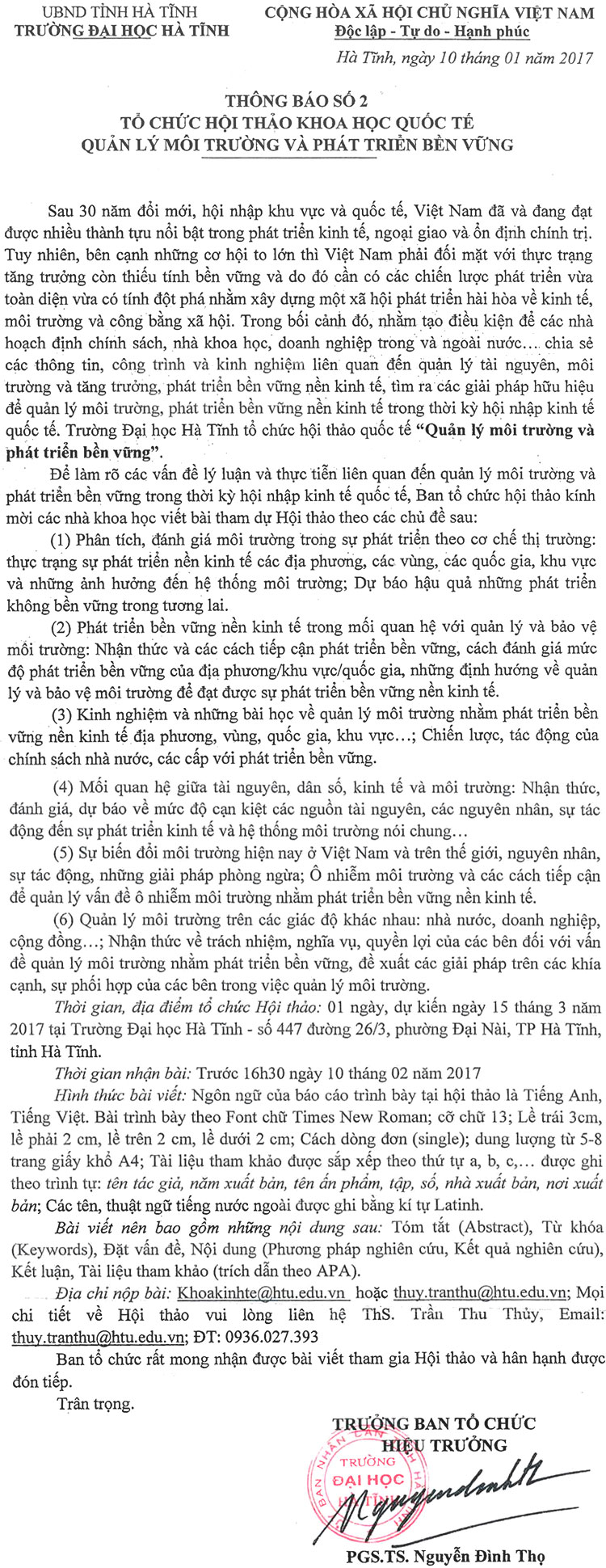 Thông báo tổ chức Hội thảo khoa học quốc tế Quản lý môi trường và phát triển bền vững - Trường Đại học Hà Tĩnh 03/02/2017 00:02 File đính kèm thu-moi-viet-bai-tham-du-hoi-thao-quoc-te-phat-trien-du-lich-ben-vung-o-cac-nuoc-tieu-vung-song-mekong.pdf