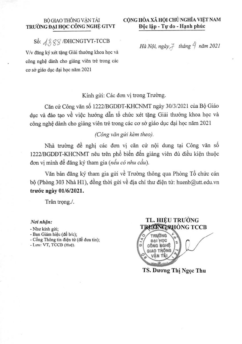 Thông báo về việc đăng ký xét tặng Giải thưởng khoa học và công nghệ dành cho giảng viên trẻ trong các cơ sở giáo dục đại học năm 2021 07/04/2021 22:04 File đính kèm 1388---HCNGTVT-TCCB.pdf