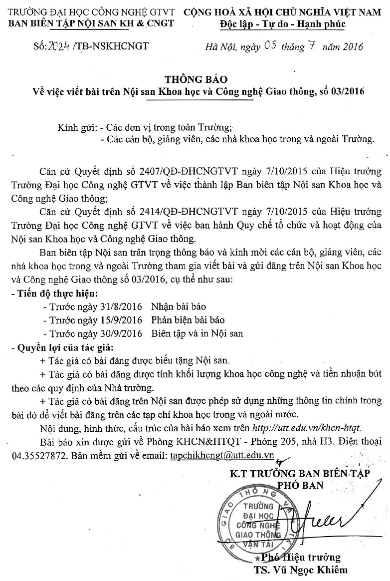 Thông báo viết bài trên Nội san Khoa học và Công nghệ Giao thông, số 3 năm 2016