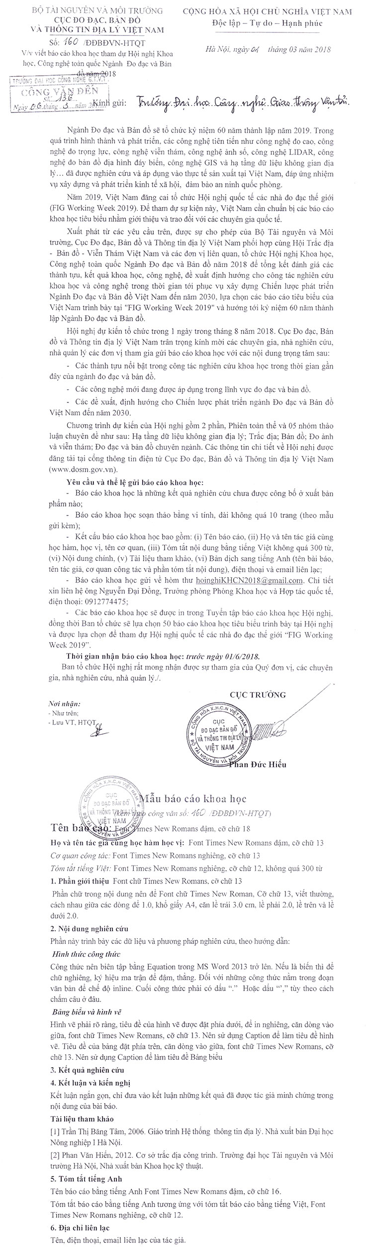 Thông báo viết báo cáo khoa học tham dự Hội nghị Khoa học, Công nghệ toàn quốc Ngành Đo đạc và Bản đồ năm 2018 07/03/2018 10:03