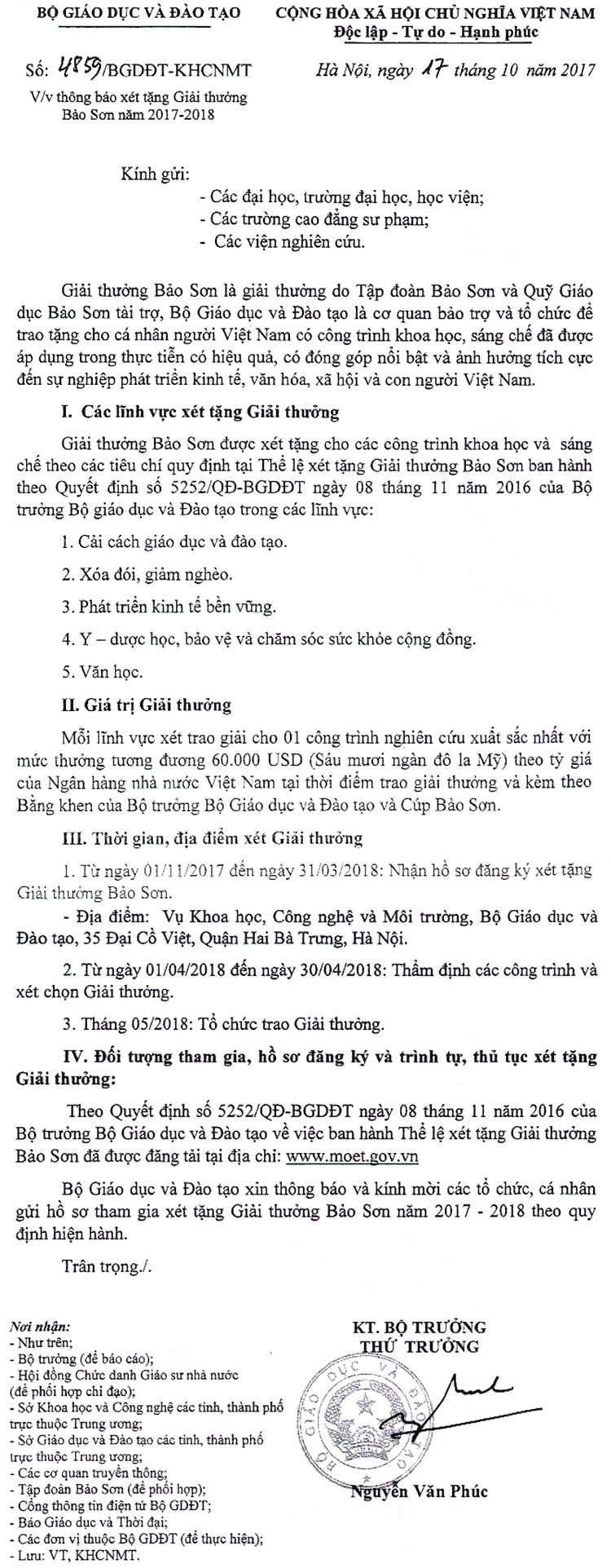 Thông báo Xét tặng Giải thưởng Bảo Sơn năm 2017 - 2018