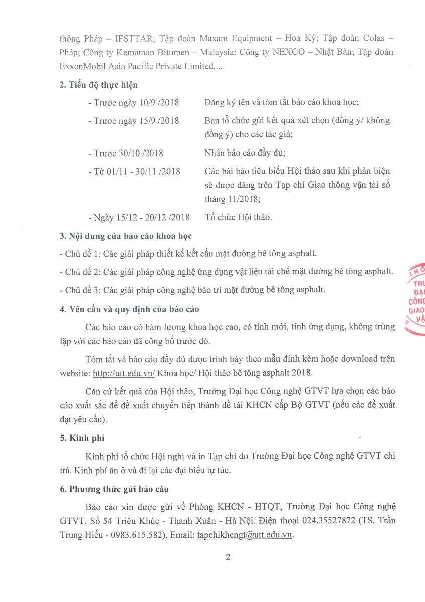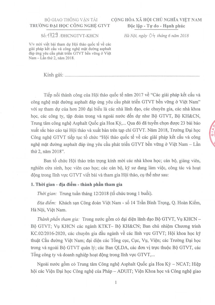 Thư mời viết bài tham dự Hội thảo quốc tế về các giải pháp kết cấu và công nghệ mặt đường asphalt đáp ứng yêu cầu phát triển GTVT bền vững ở Việt Nam – Lần thứ 2, năm 2018. 05/06/2018 17:06