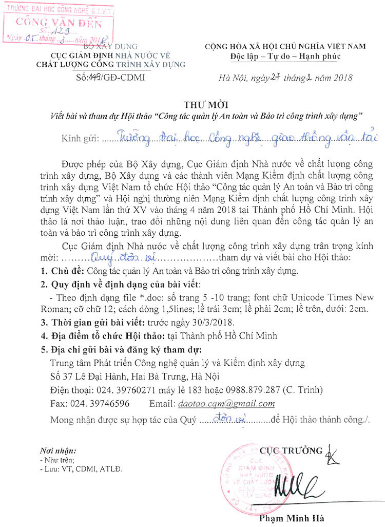 Thư mời viết bài và tham dự Hội thảo Công tác quản lý An toàn và Bảo trì công trình xây dựng 07/03/2018 14:03