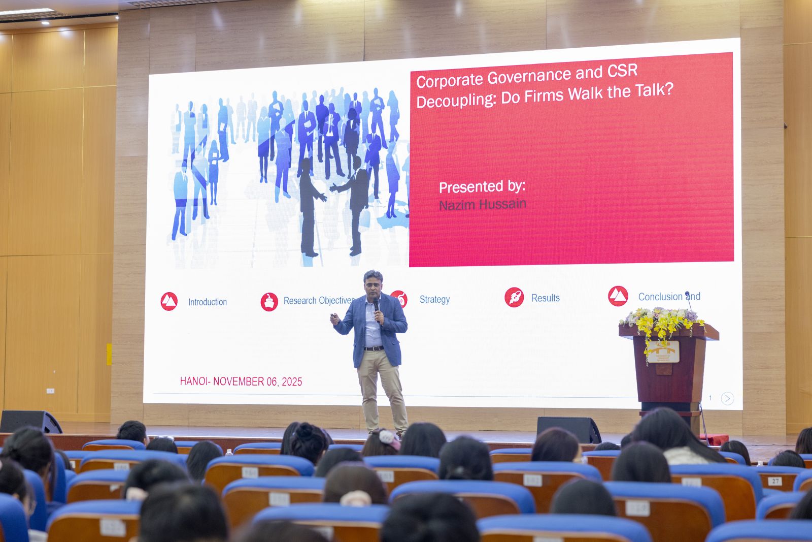 Trong phần trình bày, PGS.TS. Nazim Hussain mang đến bài tham luận “Nói đi đôi với làm: Góc nhìn quản trị doanh nghiệp về sự tách rời giữa trách nhiệm xã hội và thực tiễn doanh nghiệp”. Ông tập trung phân tích hiện tượng “CSR decoupling” - khoảng cách giữa những gì doanh nghiệp tuyên bố trong các báo cáo trách nhiệm xã hội (CSR disclosure) và những hành động thực tế mà họ thực hiện (CSR performance). Từ góc nhìn quản trị công ty, diễn giả nhấn mạnh vai trò của sự đa dạng giới trong hội đồng quản trị, cho rằng sự tham gia của phụ nữ không chỉ giúp nâng cao chất lượng giám sát mà còn thúc đẩy doanh nghiệp hướng tới các giá trị phát triển bền vững.
