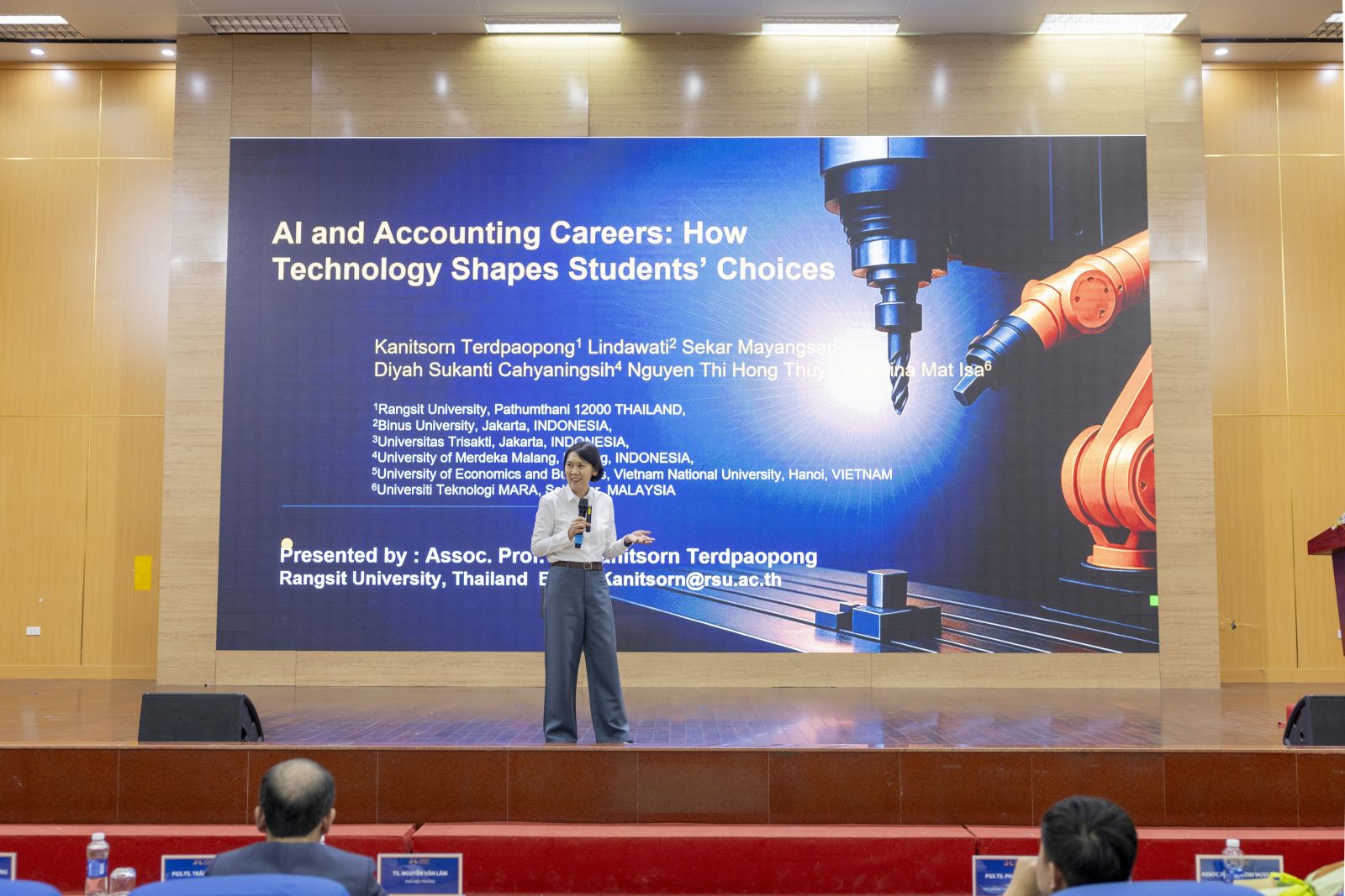 Tiếp đó, PGS.TS. Kanitsorn Terdpaopong trình bày tham luận “Định hình lại nghề kế toán: Trí tuệ nhân tạo ảnh hưởng thế nào đến lựa chọn nghề nghiệp của sinh viên”. Bà phân tích tác động của trí tuệ nhân tạo đối với định hướng nghề nghiệp của sinh viên kế toán trong bối cảnh khu vực Đông Nam Á đang chuyển đổi mạnh mẽ về công nghệ. Theo bà, sinh viên trong kỷ nguyên AI cần phát triển năng lực kép: vừa am hiểu công nghệ, vừa có tư duy phân tích, phán đoán và đạo đức nghề nghiệp. Nghề kế toán vì thế không còn chỉ là “ghi sổ và tính toán”, mà trở thành nghề nghiệp đảm bảo tính minh bạch và độ tin cậy của thông tin tài chính trong hệ thống AI.