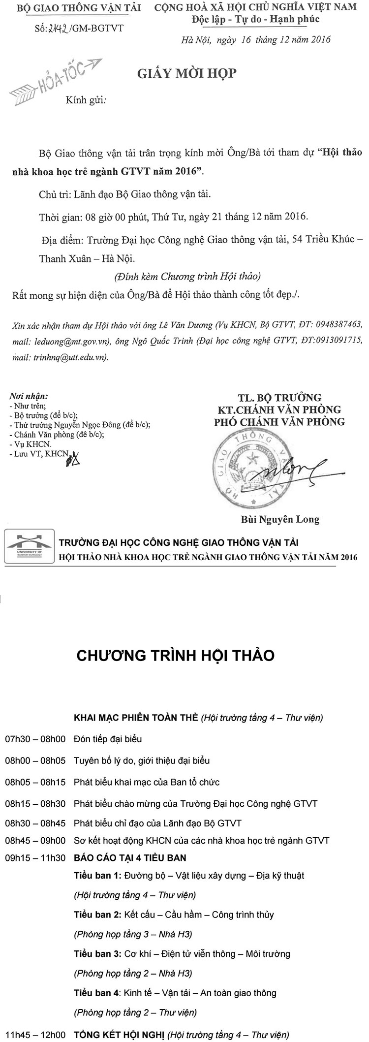 Giấy mời tham dự Hội thảo nhà khoa học trẻ ngành GTVT năm 2016
