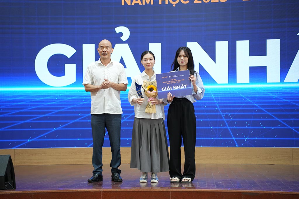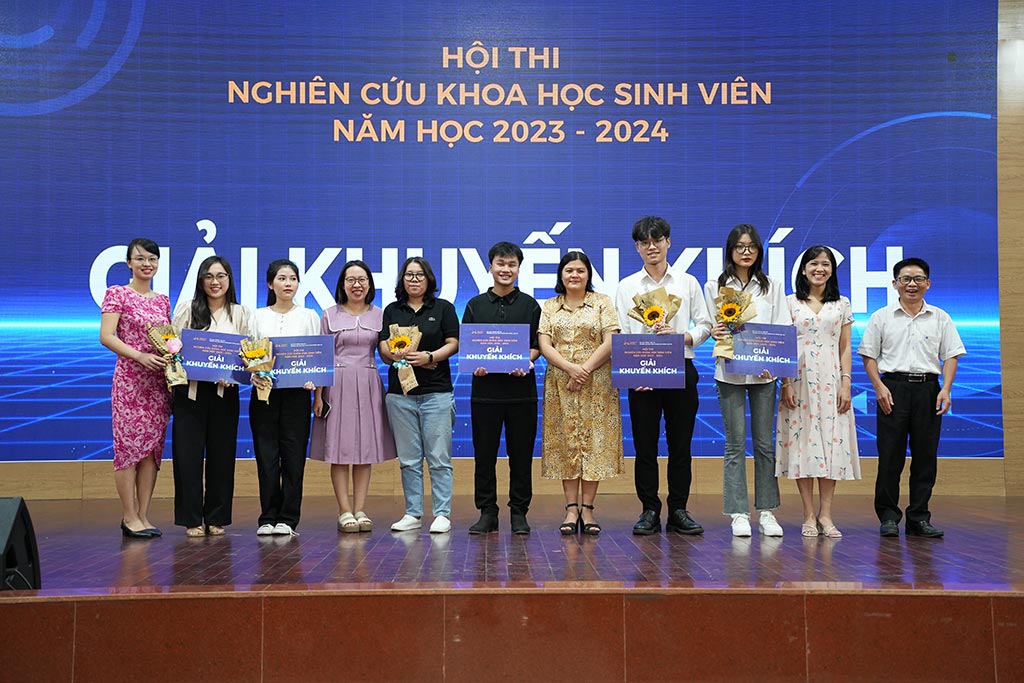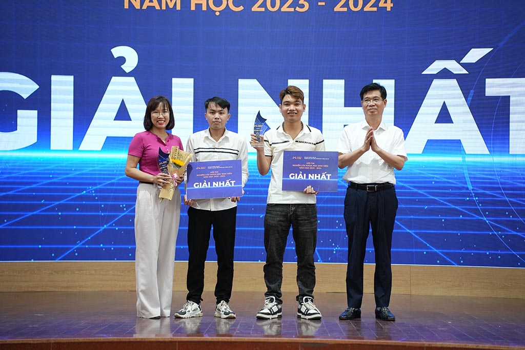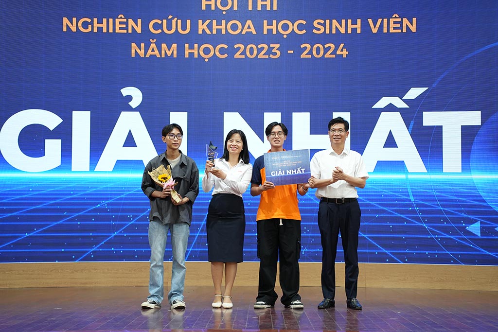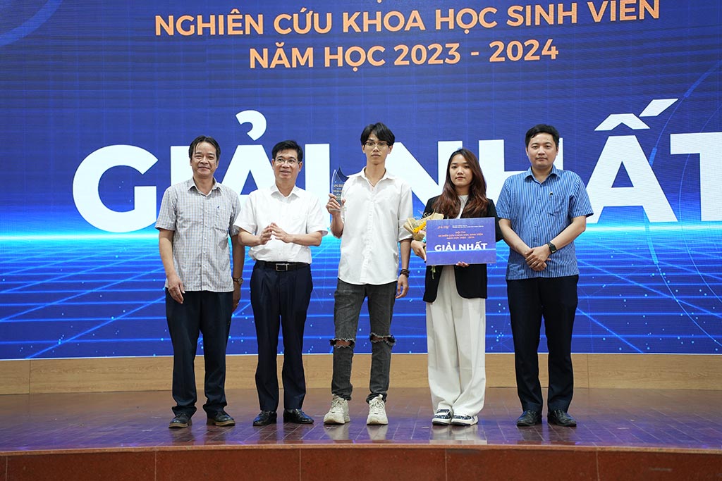 Đại diện Lãnh đạo Phòng KHCN-HTQT và Các Khoa, Viện trao Giải cho các nhóm sinh viên