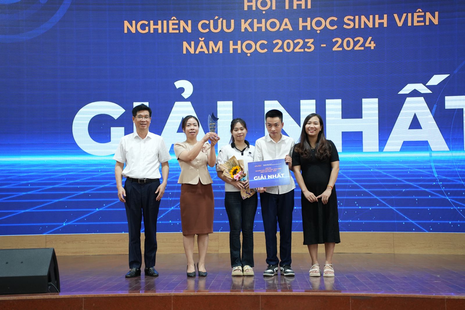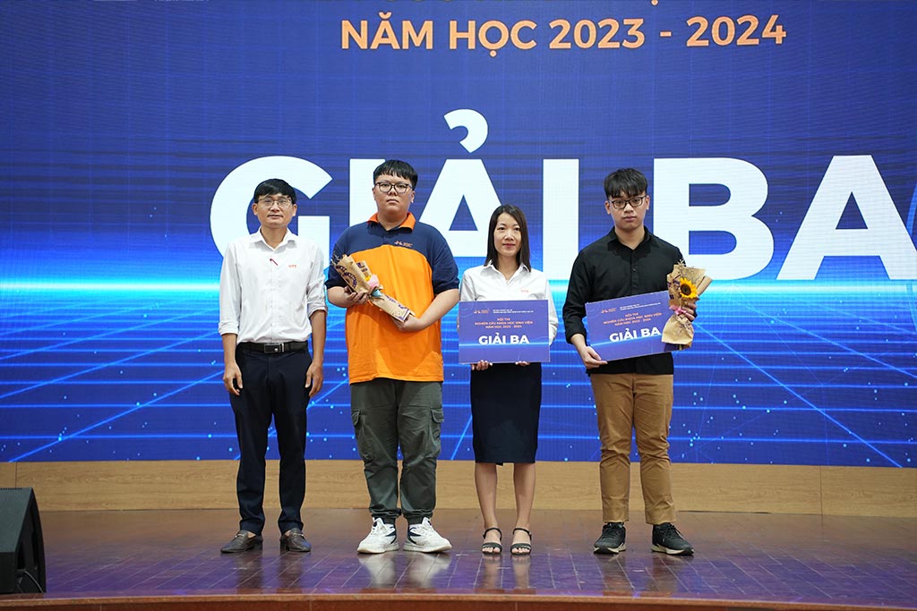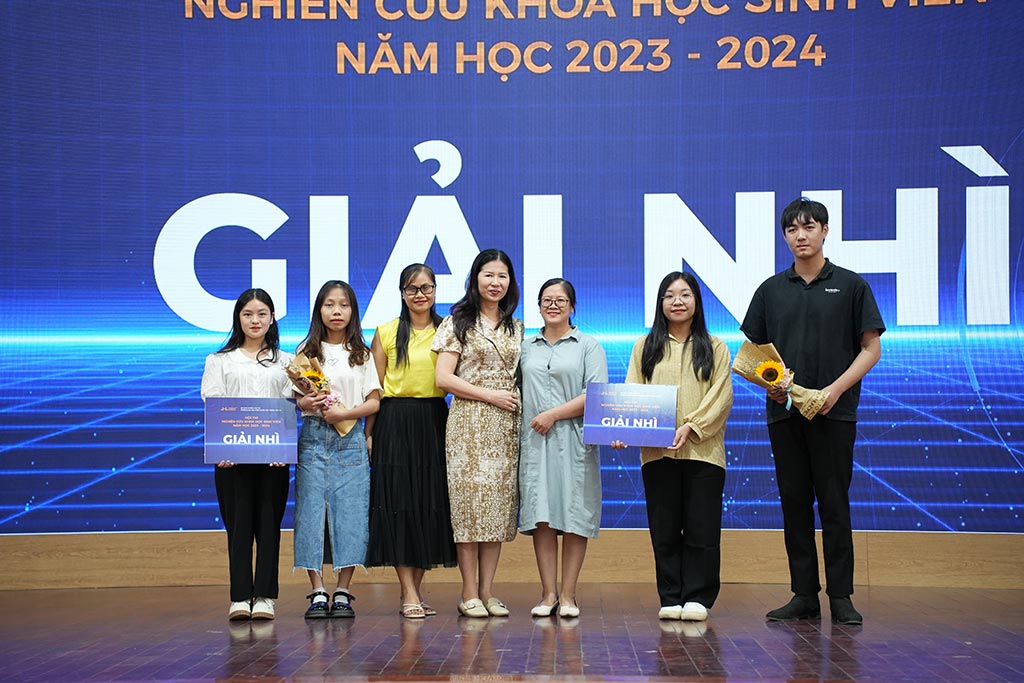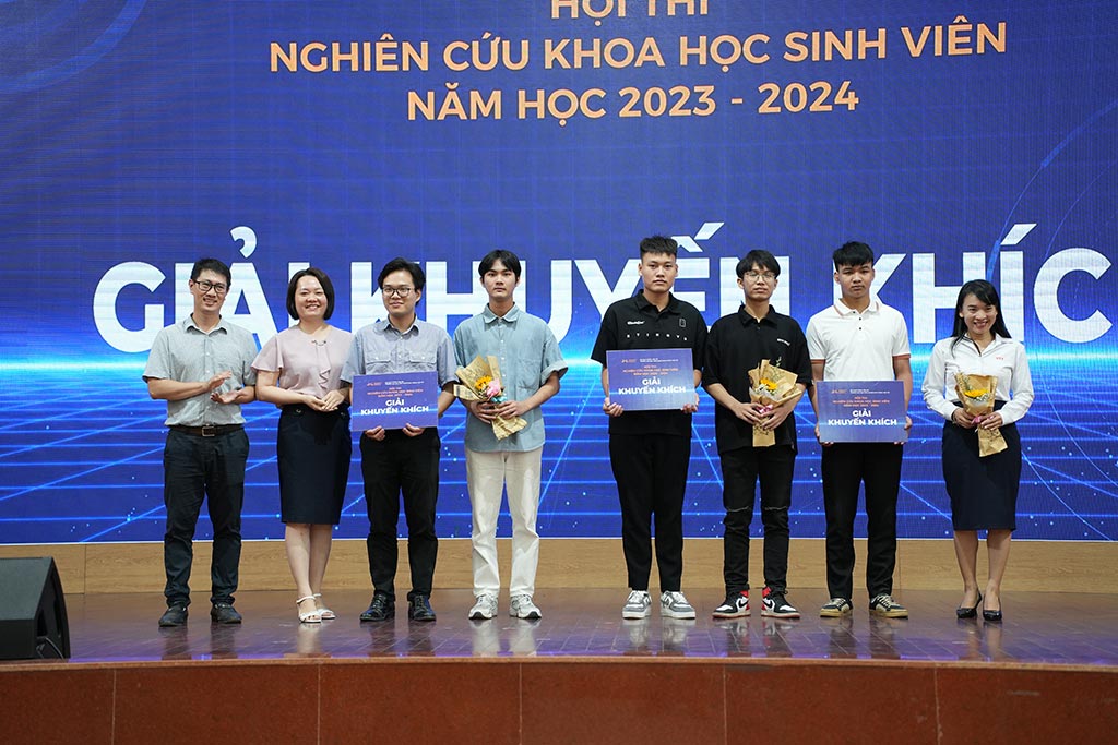 Đại diện Lãnh đạo Phòng KHCN-HTQT và Các Khoa, Viện trao Giải cho các nhóm sinh viên