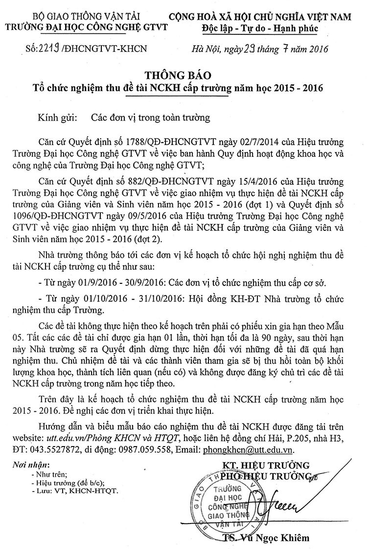Thông báo Tổ chức nghiệm thu đề tài NCKH cấp trường năm học 2015 - 2016