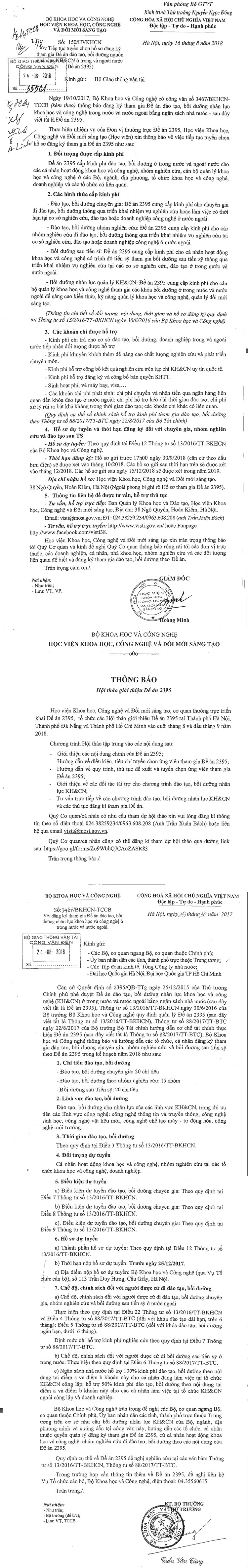 Thông báo Tuyển chọn hồ sơ đăng ký tham gia Đề án đào tạo, bồi dưỡng nguồn nhân lực KH&CN ở trong và ngoài nước (Đề án 2395) 12/09/2018 15:09
