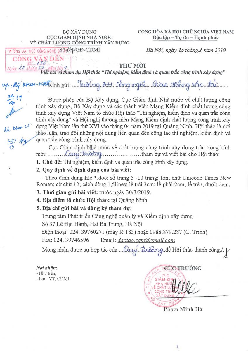 Thư mời viết bài và tham dự Hội thảo Thí nghiệm, kiểm định và quan trắc công trình xây dựng 25/02/2019 15:02