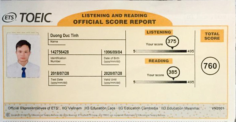 Sau khi kiến thức được củng cố, mình học thêm khóa luyện đề ở trung tâm khoảng 1 tháng nữa rồi đi thi. Ban đầu có hơi run, nhưng được cô khuyên “Không thi lúc này, để sang tháng sau, sau nữa, không động đến thì quên mất”, nên mình quyết tâm đi đăng ký luôn. Mình đăng ký vào đầu tháng 7/2018, đến cuối tháng thì thi. Khoảng thời gian này, mình ôn luyện lại từ bộ đề Economy, sau đó với tâm thế thoải mái, khá tự tin, chắc chắn sẽ đạt được 600 TOEIC mình đi thi. Và kết quả thật bất ngờ, mình được 760 – đúng với số điểm mà các cô ở trung tâm đã dự đoán. Bây giờ, khi đạt yêu cầu về chứng chỉ TOEIC, mình dự định học thêm khóa giao tiếp để phục vụ cho công việc, cuộc sống sau này nữa.