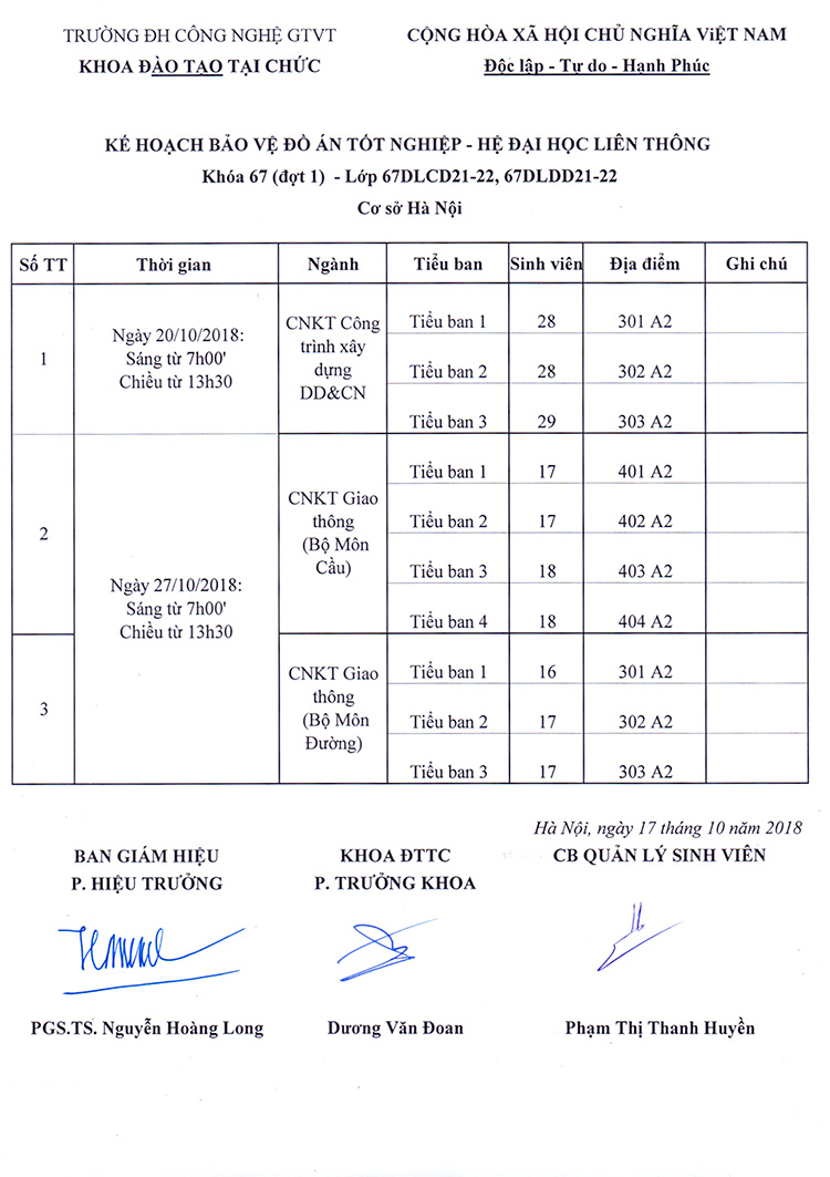 Kế hoạch bảo vệ đồ án tốt nghiệp hệ ĐHLT - Lớp 67DLCD21-22, 67DLDD21-22 cơ sở Hà Nội 19/10/2018 14:10