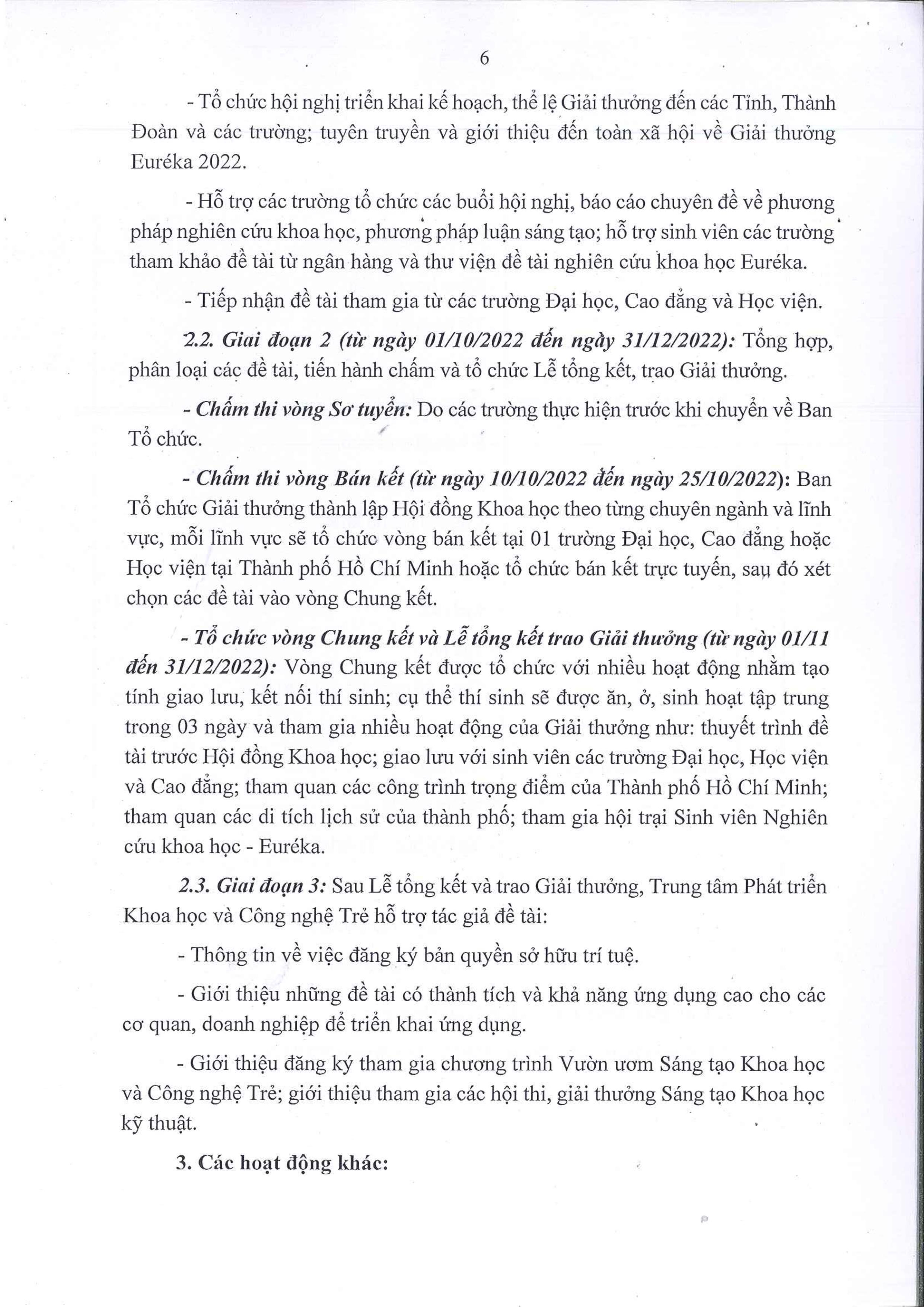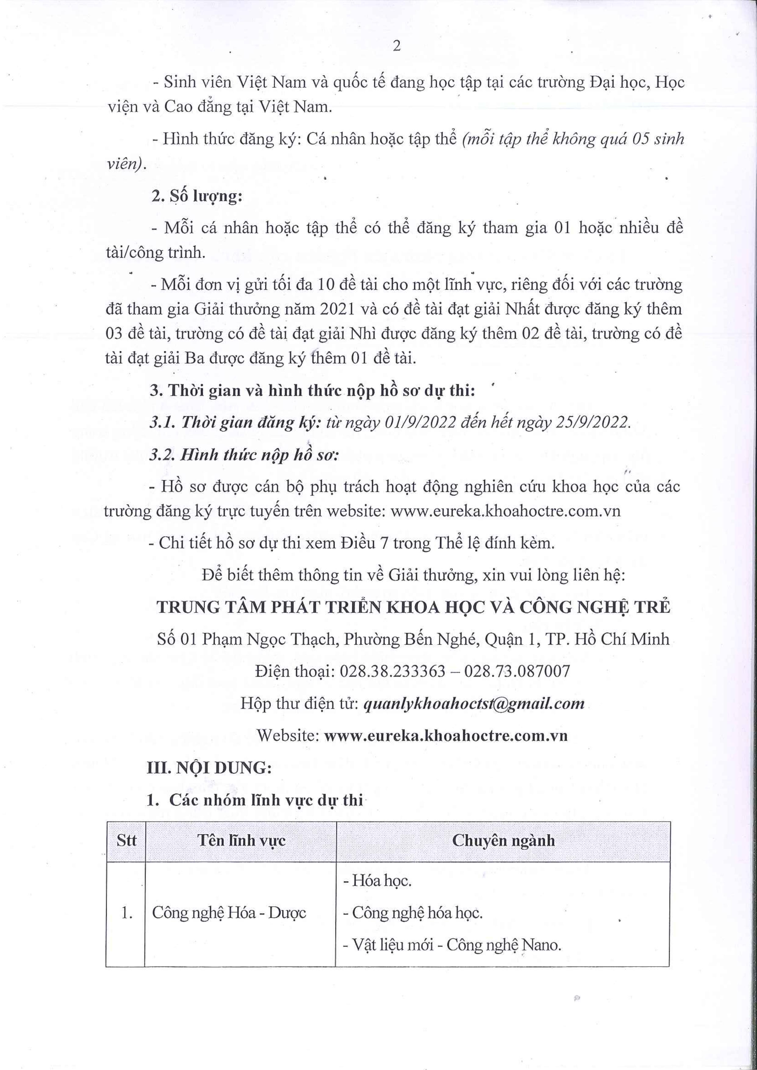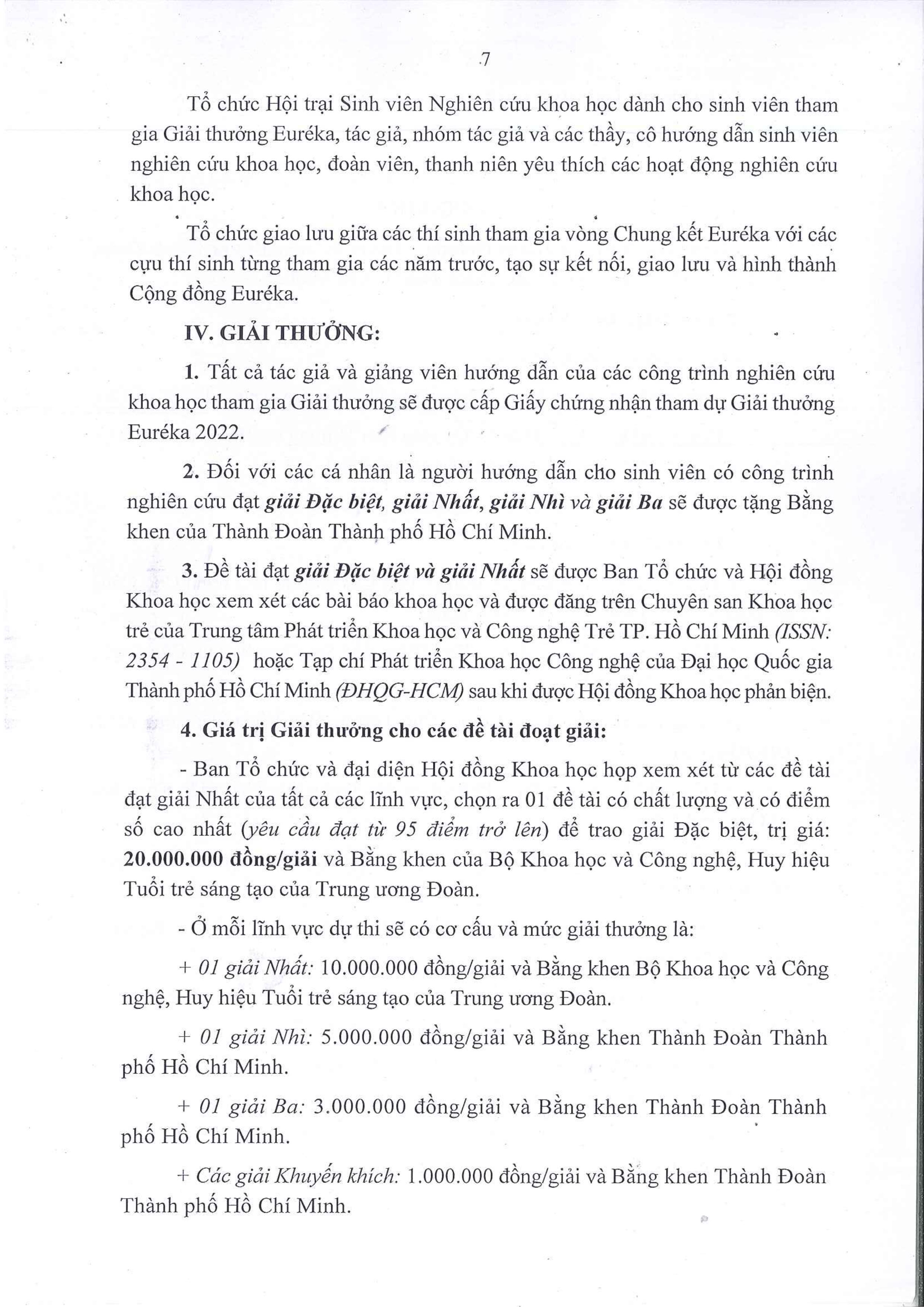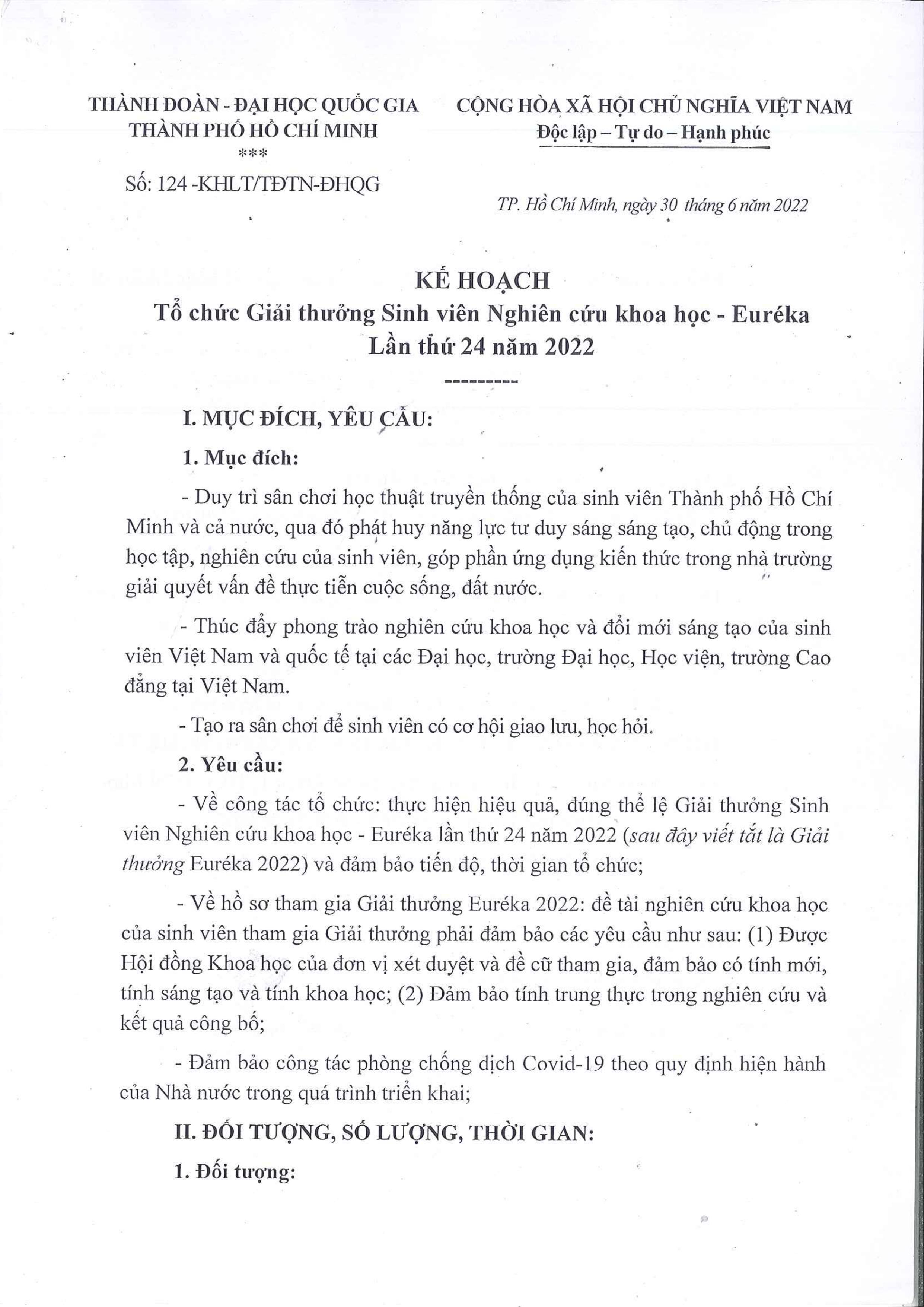 Kế hoạch tổ chức Giải thưởng sinh viên Nghiên cứu khoa học - Eureka lần thứ 24 năm 2022 18/07/2022 10:07 File đính kèm The-le-Eureka-2022.docx