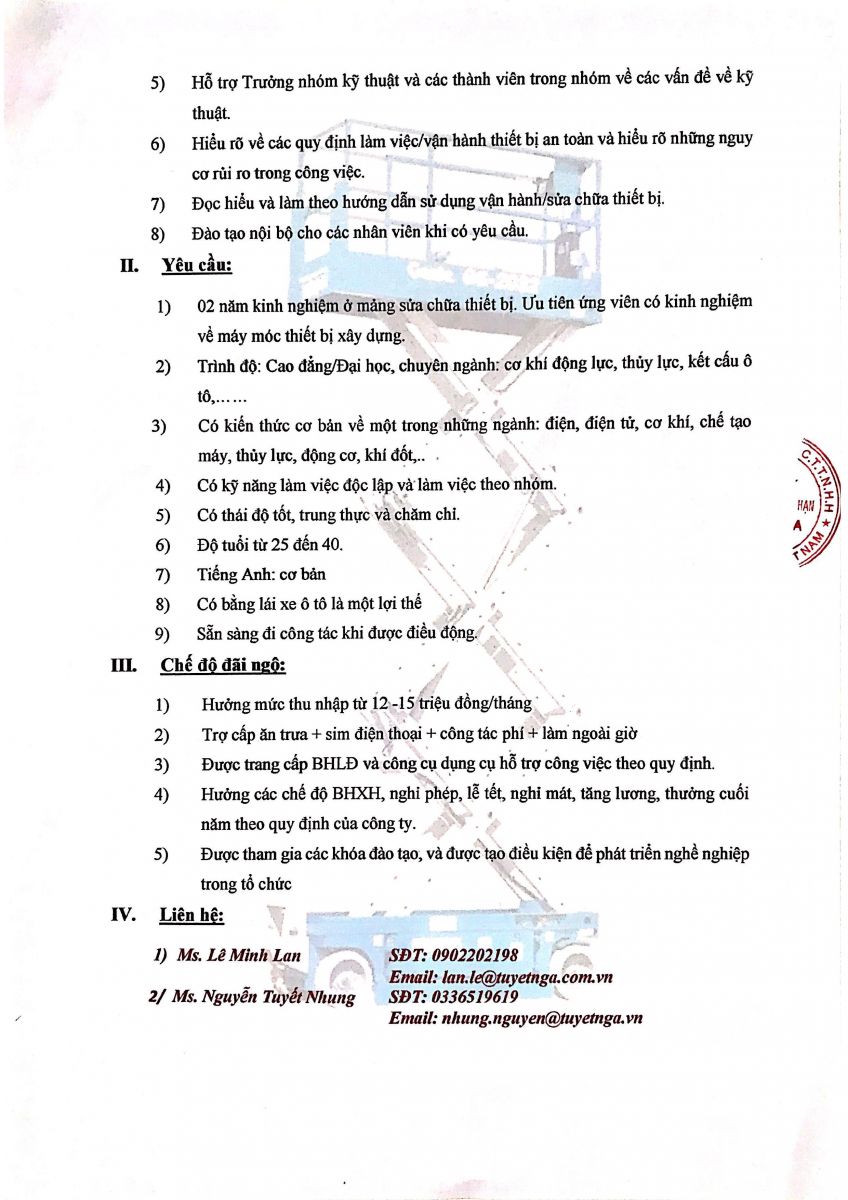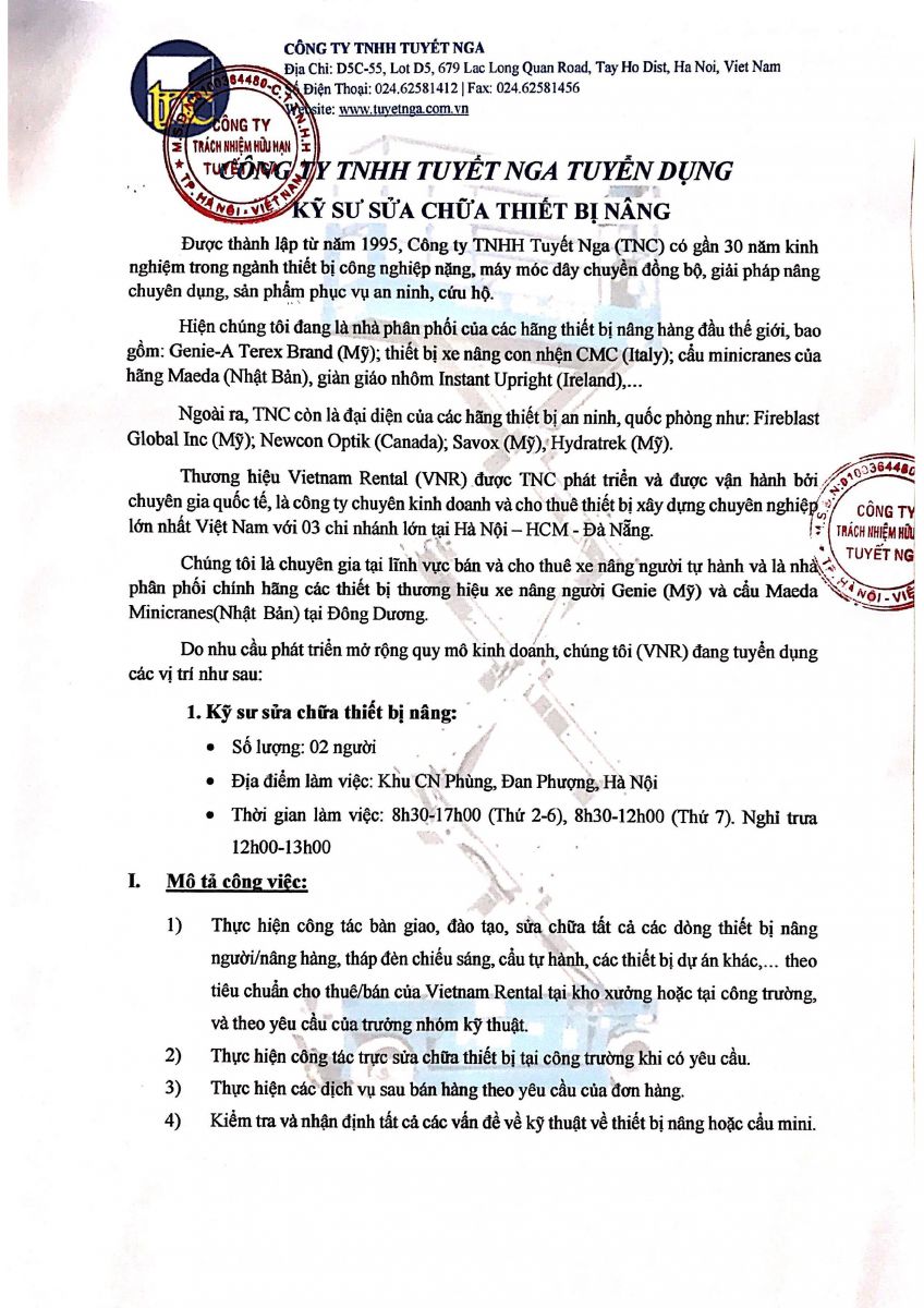Công ty TNHH Tuyết Nga tuyển dụng Kỹ sư sửa chữa thiết bị nâng