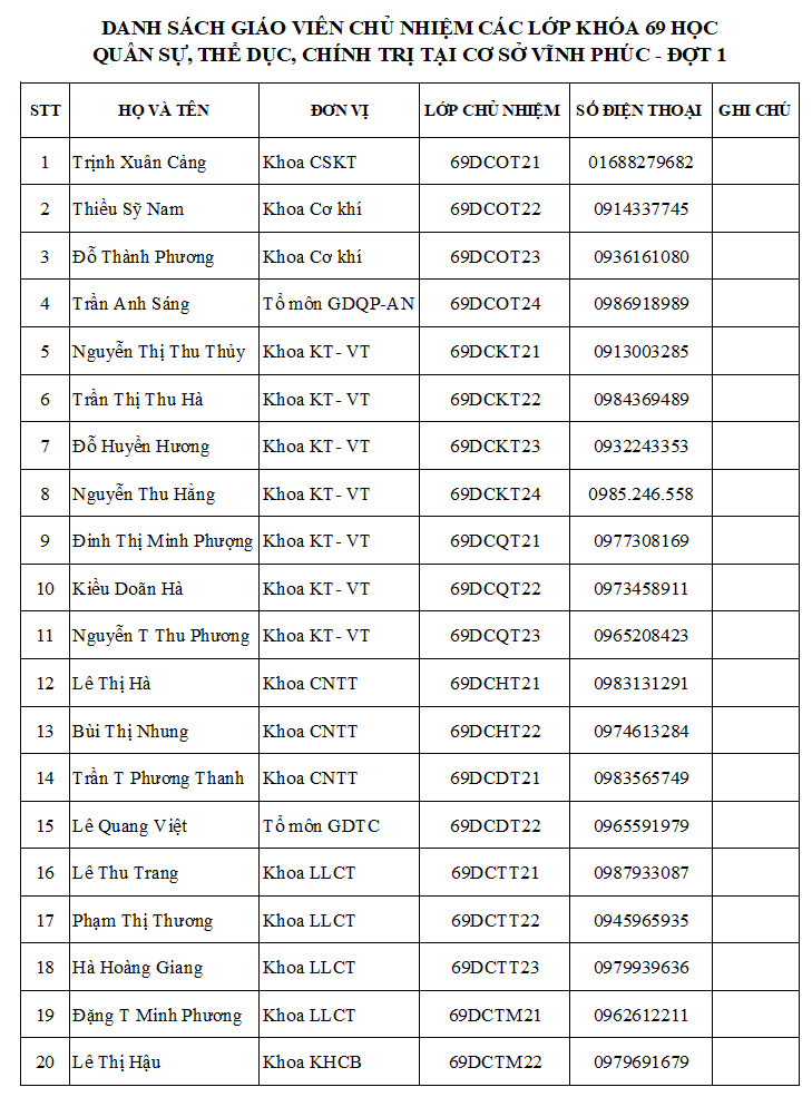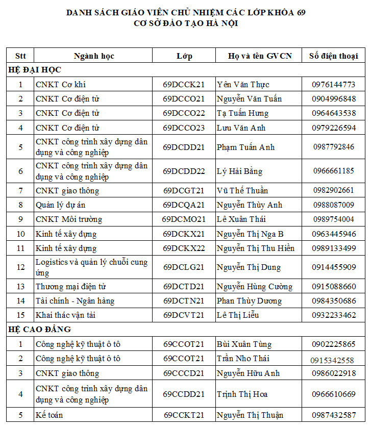 Danh sách Giáo viên chủ nhiệm các lớp Khóa 69