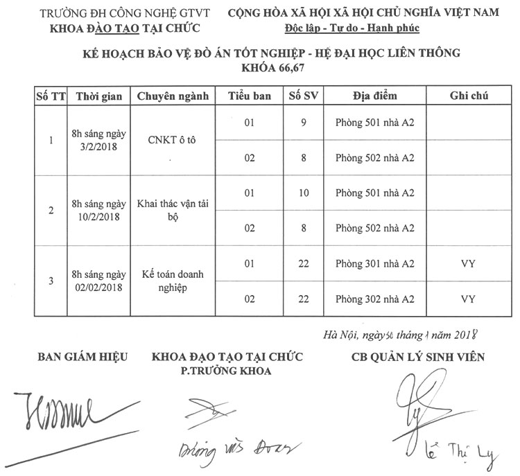 Kế hoạch Bảo vệ đồ án tốt nghiệp - Hệ Đại học liên thông Khóa 66, 67