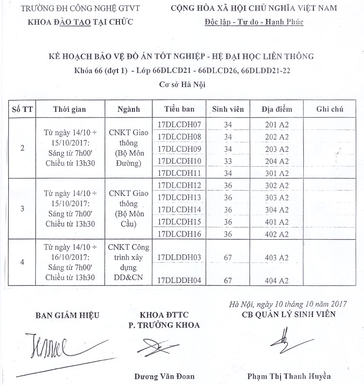 Kế hoạch bảo vệ đồ án tốt nghiệp Hệ đại học liên thông - Khoá 66 (đợt 1 - lần 2)