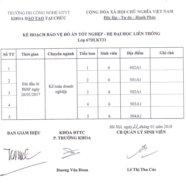 Kế hoạch bảo vệ đồ án tốt nghiệp - Hệ Đại học liên thông, Lớp 67DLKT21