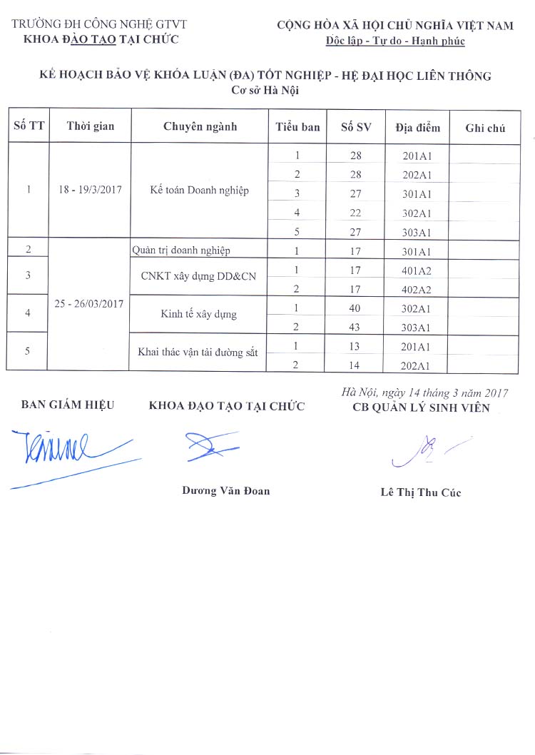 Kế hoạch bảo vệ khóa luận tốt nghiệp, hệ ĐHLT cơ sở Hà Nội