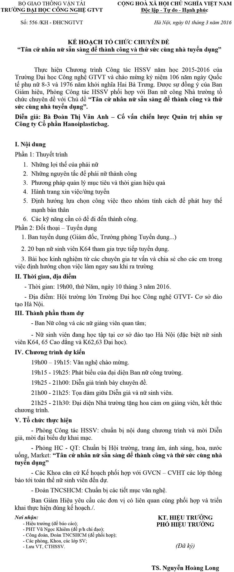 Kế hoạch tổ chức tọa đàm nhân ngày 8/3 cho nữ sinh viên Cơ sở Hà Nội