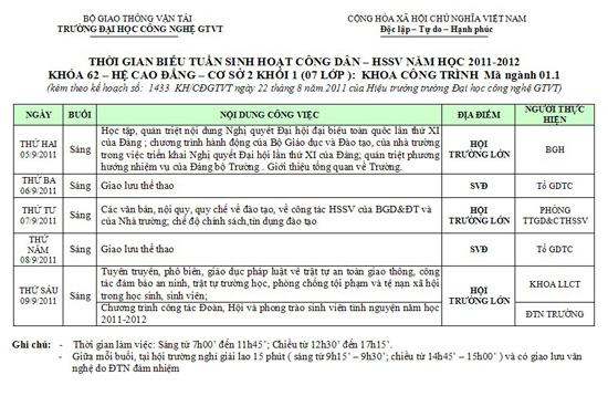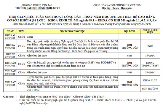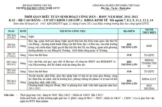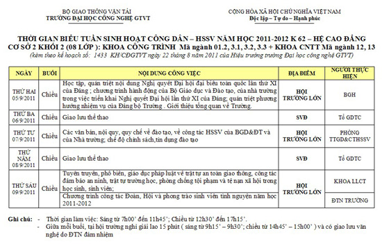 Thời gian biểu tuần sinh hoạt công dân HSSV Khóa 62 05/09/2011 00:09 Nhà trường thông báo Thời gian biểu Tuần sinh hoạt công dân Khóa 62 năm học 2011 - 2012 như sau :