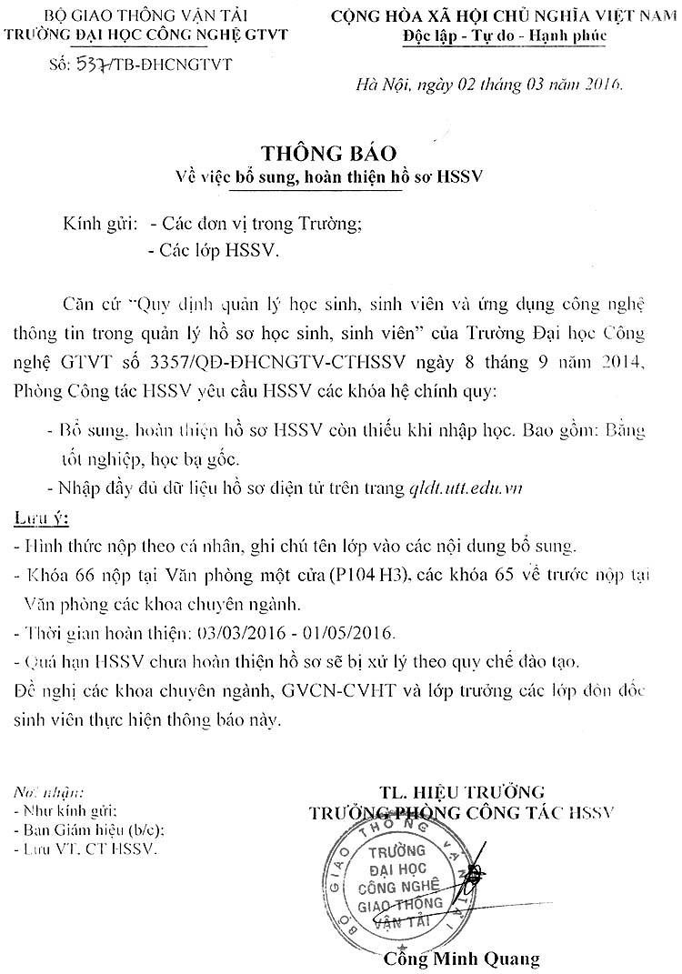 Thông báo bổ sung, hoàn thiện hồ sơ HSSV