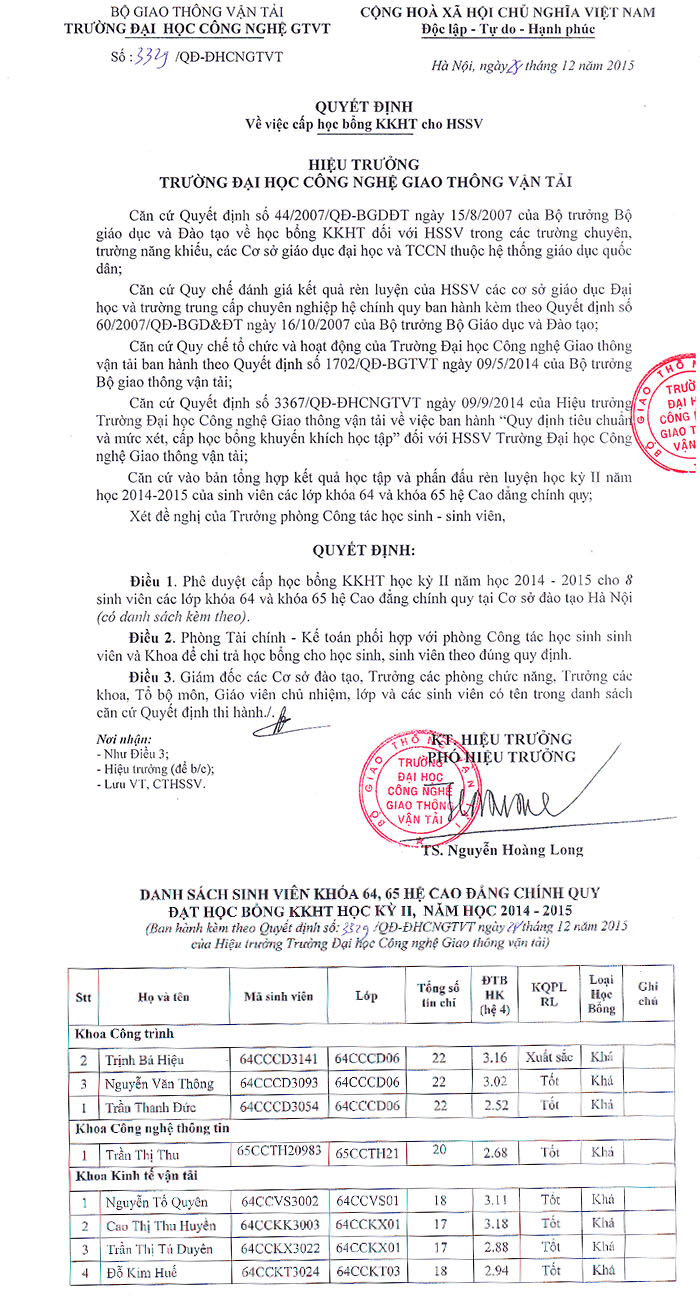 Thông báo cấp học bổng KKHT cho HSSV kỳ 2 năm học 2014 - 2015