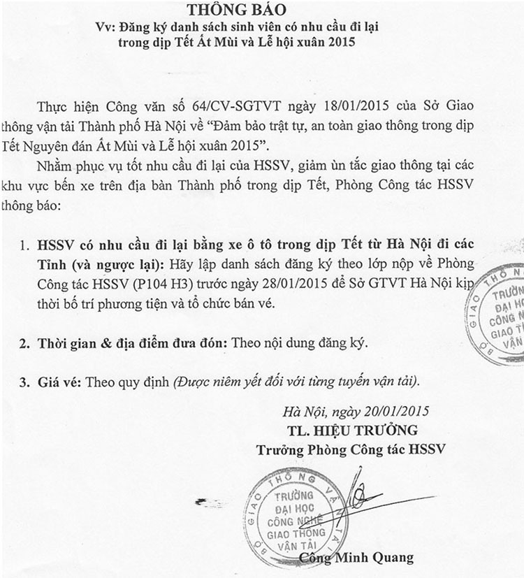 Thông báo Đăng ký danh sách sinh viên có nhu cầu đi lại trong dịp Tết Ất Mùi và Lễ hội xuân 2015 21/01/2015 00:01 Mẫu đăng ký xem tệp đính kèm. mau-dang-ky-xe-oto-tet-2015.xls [Mẫu đăng ký xe ôtô tết Ất Mùi 2015] 27 kB