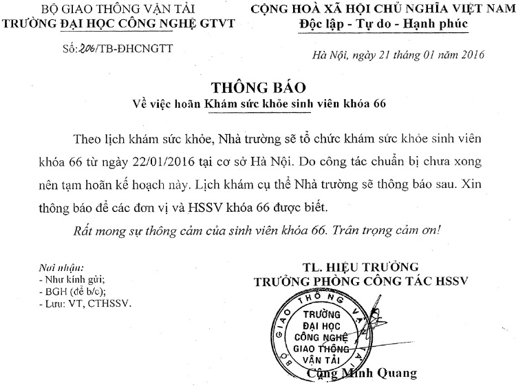 Thông báo hoãn Khám sức khỏe sinh viên Khóa 66
