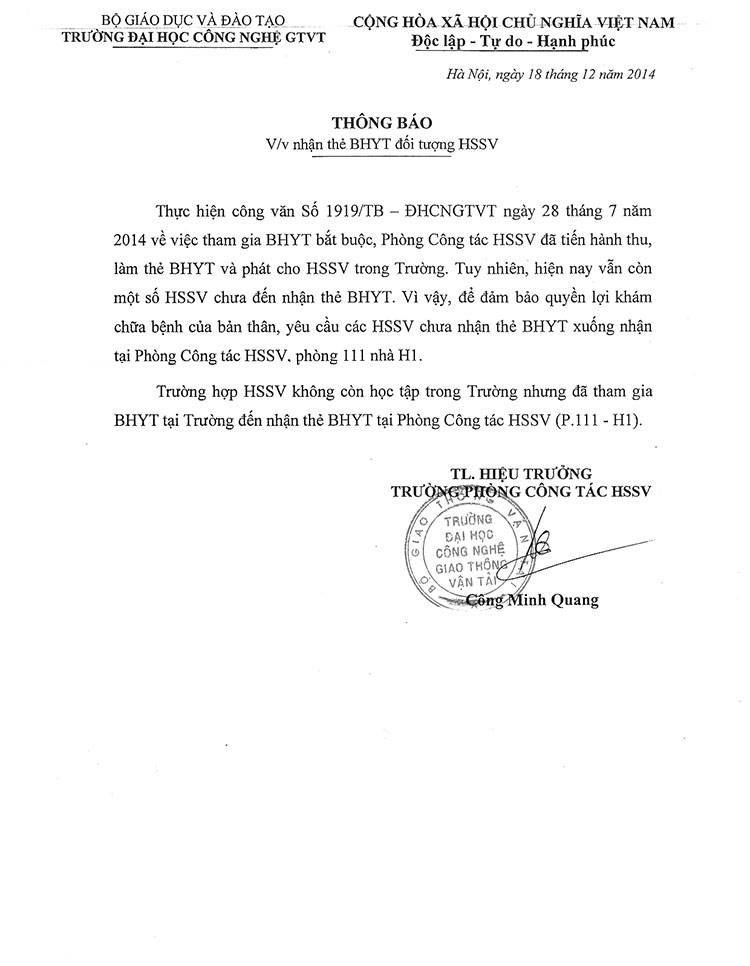 Thông báo nhận thẻ BHYT đối tượng học sinh sinh viên