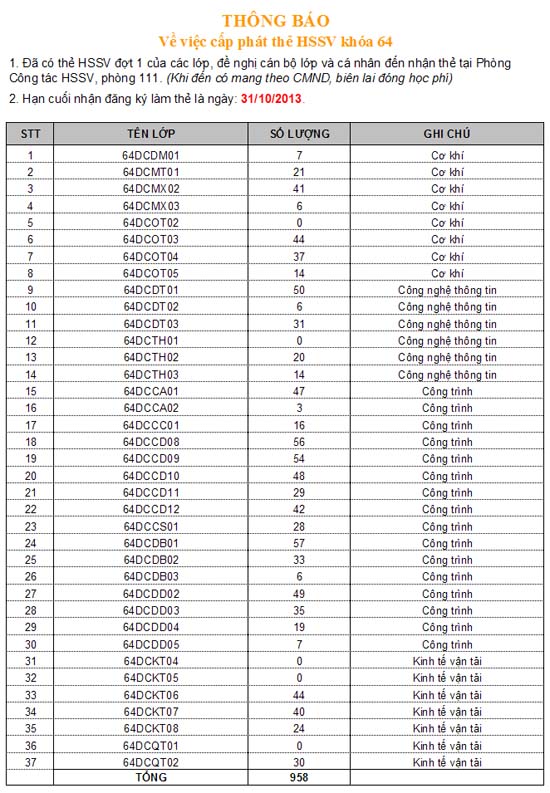Thông báo phát thẻ sinh viên cho Khóa 64 (Đợt 1) 25/10/2013 00:10 Nhà trường thông báo về việc phát thẻ sinh viên đợt 1 cho khóa 64 như sau: