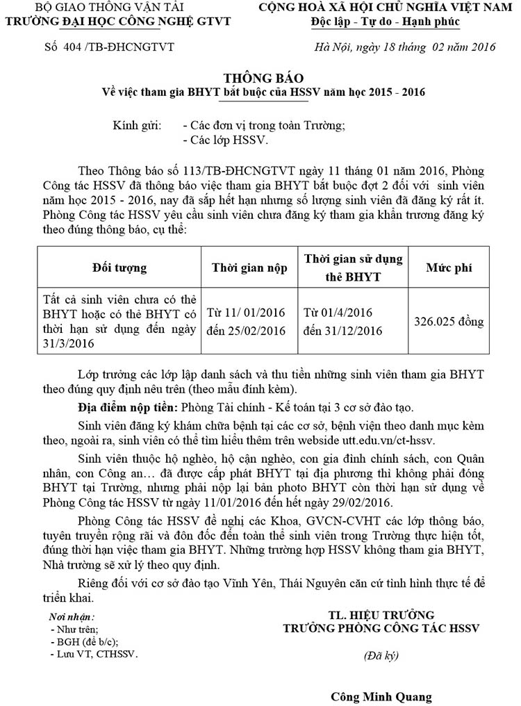 Thông báo tham gia BHYT bắt buộc của HSSV năm học 2015 - 2016