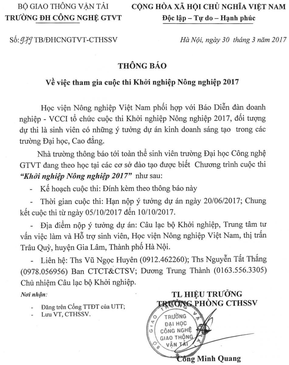 Thông báo tham gia cuộc thi Khởi nghiệp Nông nghiệp 2017 30/03/2017 15:03 File đính kèm 979.pdf Ke-hoach-Khoi-nghiep-Nong-nghiep-2017.pdf Tin liên quan Thông báo xin ý kiến đóng góp vào dự thảo các văn bản tháng 10 năm 2023 31/10/2023 Thông báo chương trình học bổng tiến sĩ Nhật Bản năm 2024 18/10/2023 Thông báo gia hạn Vòng 1 và hình thức nộp bài Cuộc thi Sinh viên UTT với ý tưởng khởi nghiệp năm 2022 28/09/2022 Kế hoạch tổ chức Giải thưởng sinh viên Nghiên cứu khoa học - Eureka lần thứ 24 năm 2022 18/07/2022 Kế hoạch tổ chức cuộc thi Sinh viên UTT với ý tưởng Khởi nghiệp năm 2022 12/07/2022 Kế hoạch ôn luyện đội tuyển dự thi Olympic Cơ học toàn quốc lần thứ XXXII và Olympic Toán học sinh viên năm 2021 12/01/2021