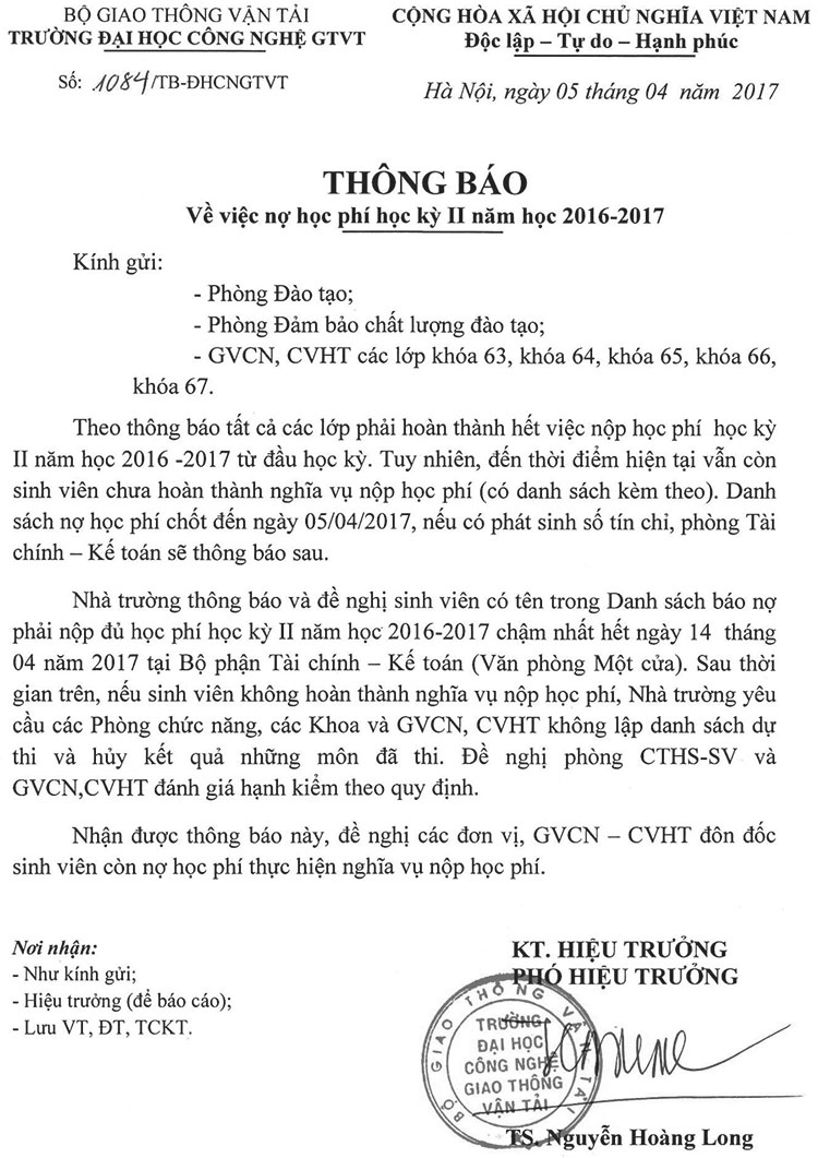 Thông báo về việc nợ học phí học kỳ II năm học 2016 - 2017 05/04/2017 14:04 File đính kèm K63DHCQ.xls K64DHCQ.xls K65CDCQ.xls hoc-lai-he.xlsx K65CDN.xls K66CDCQ.xls K66CDN.xls K65DHCQ.xls K66DHLT.xls K66DHCQ.xls K67CDCQ.xls K67CDN.xls K67DHLT.xls K67DHCQ.xls Tin liên quan Thông báo xin ý kiến đóng góp vào dự thảo các văn bản tháng 10 năm 2023 31/10/2023 Thông báo chương trình học bổng tiến sĩ Nhật Bản năm 2024 18/10/2023 Thông báo gia hạn Vòng 1 và hình thức nộp bài Cuộc thi Sinh viên UTT với ý tưởng khởi nghiệp năm 2022 28/09/2022 Kế hoạch tổ chức Giải thưởng sinh viên Nghiên cứu khoa học - Eureka lần thứ 24 năm 2022 18/07/2022 Kế hoạch tổ chức cuộc thi Sinh viên UTT với ý tưởng Khởi nghiệp năm 2022 12/07/2022 Kế hoạch ôn luyện đội tuyển dự thi Olympic Cơ học toàn quốc lần thứ XXXII và Olympic Toán học sinh viên năm 2021 12/01/2021 Tin nổi bật Bộ Xây dựng tổ chức Hội nghị công tác đào tạo khối các trường đại học thuộc Bộ 06/11/2025 17:11 Sinh viên chuyên ngành Trí tuệ nhân tạo & Giao thông thông minh UTT: Kiến tạo tương lai cùng doanh nghiệp 04/11/2025 08:11 UTT Awards 2025: Khi người học nói lời tri ân những người Tận tâm- Tận hiến vì UTT 29/10/2025 14:10 UTT ra mắt Mạng lưới trung tâm đào tạo xuất sắc và tài năng trong lĩnh vực Công nghệ giao thông và Hạ tầng tiên... 10/10/2025 13:10 Thông tin mới nhất Thông báo về việc đăng ký tham dự Hội thảo “Cùng nhau vươn lên: Kỹ năng lãnh đạo cho tương lai của giáo dục đại... 12/11/2025 15:11 Tọa đàm khoa học: Vai trò của trí tuệ nhân tạo trong nghiên cứu và giảng dạy lĩnh vực tài chính - kế toán 11/11/2025 10:11 Bộ Xây dựng tổ chức Hội nghị công tác đào tạo khối các trường đại học thuộc Bộ 06/11/2025 17:11 Đại hội Hội Cựu chiến binh Trường Đại học Công nghệ GTVT nhiệm kỳ 2025-2030 04/11/2025 15:11 Sinh viên chuyên ngành Trí tuệ nhân tạo & Giao thông thông minh UTT: Kiến tạo tương lai cùng doanh nghiệp 04/11/2025 08:11