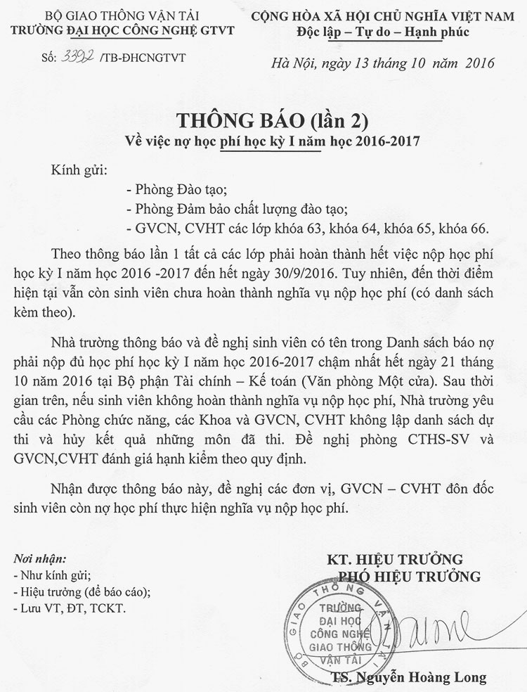 Thông báo về việc nợ học phí kỳ I năm học 2016 - 2017 (lần 2) 14/10/2016 15:10 File đính kèm DanhSachSinhVienNoPhi-64CDN.xls DanhSachSinhVienNoPhi-K64CDCQ.xls DanhSachSinhVienNoPhi-K63DHCQ.xls DanhSachSinhVienNoPhi-K65CDCQ.xls DanhSachSinhVienNoPhi-K65CDN.xls DanhSachSinhVienNoPhi-K64DHCQ.xls DanhSachSinhVienNoPhi-K65DHCQ.xls DanhSachSinhVienNoPhi-K66CDCQ.xls DanhSachSinhVienNoPhi-K65DHLT.xls DanhSachSinhVienNoPhi-K66CDN.xls DanhSachSinhVienNoPhi-K66DHLT.xls dsach-no-thong-tu-200.xlsx DanhSachSinhVienNoPhi-K66DHCQ.xls hoc-lai-lan-4--final.xlsx Tin liên quan Thông báo xin ý kiến đóng góp vào dự thảo các văn bản tháng 10 năm 2023 31/10/2023 Thông báo chương trình học bổng tiến sĩ Nhật Bản năm 2024 18/10/2023 Thông báo gia hạn Vòng 1 và hình thức nộp bài Cuộc thi Sinh viên UTT với ý tưởng khởi nghiệp năm 2022 28/09/2022 Kế hoạch tổ chức Giải thưởng sinh viên Nghiên cứu khoa học - Eureka lần thứ 24 năm 2022 18/07/2022 Kế hoạch tổ chức cuộc thi Sinh viên UTT với ý tưởng Khởi nghiệp năm 2022 12/07/2022 Kế hoạch ôn luyện đội tuyển dự thi Olympic Cơ học toàn quốc lần thứ XXXII và Olympic Toán học sinh viên năm 2021 12/01/2021 Tin nổi bật Bộ Xây dựng tổ chức Hội nghị công tác đào tạo khối các trường đại học thuộc Bộ 06/11/2025 17:11 Sinh viên chuyên ngành Trí tuệ nhân tạo & Giao thông thông minh UTT: Kiến tạo tương lai cùng doanh nghiệp 04/11/2025 08:11 UTT Awards 2025: Khi người học nói lời tri ân những người Tận tâm- Tận hiến vì UTT 29/10/2025 14:10 UTT ra mắt Mạng lưới trung tâm đào tạo xuất sắc và tài năng trong lĩnh vực Công nghệ giao thông và Hạ tầng tiên... 10/10/2025 13:10 Thông tin mới nhất Trường Đại học Công nghệ GTVT tăng cường hợp tác quốc tế với Trường Đại học Công nghệ Thông tin và Quản lý... 13/11/2025 10:11 Thông báo về việc đăng ký tham dự Hội thảo “Cùng nhau vươn lên: Kỹ năng lãnh đạo cho tương lai của giáo dục đại... 12/11/2025 15:11 Tọa đàm khoa học: Vai trò của trí tuệ nhân tạo trong nghiên cứu và giảng dạy lĩnh vực tài chính - kế toán 11/11/2025 10:11 Bộ Xây dựng tổ chức Hội nghị công tác đào tạo khối các trường đại học thuộc Bộ 06/11/2025 17:11 Đại hội Hội Cựu chiến binh Trường Đại học Công nghệ GTVT nhiệm kỳ 2025-2030 04/11/2025 15:11