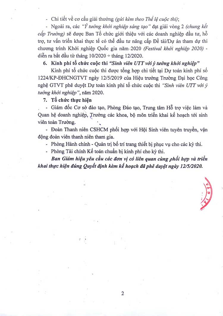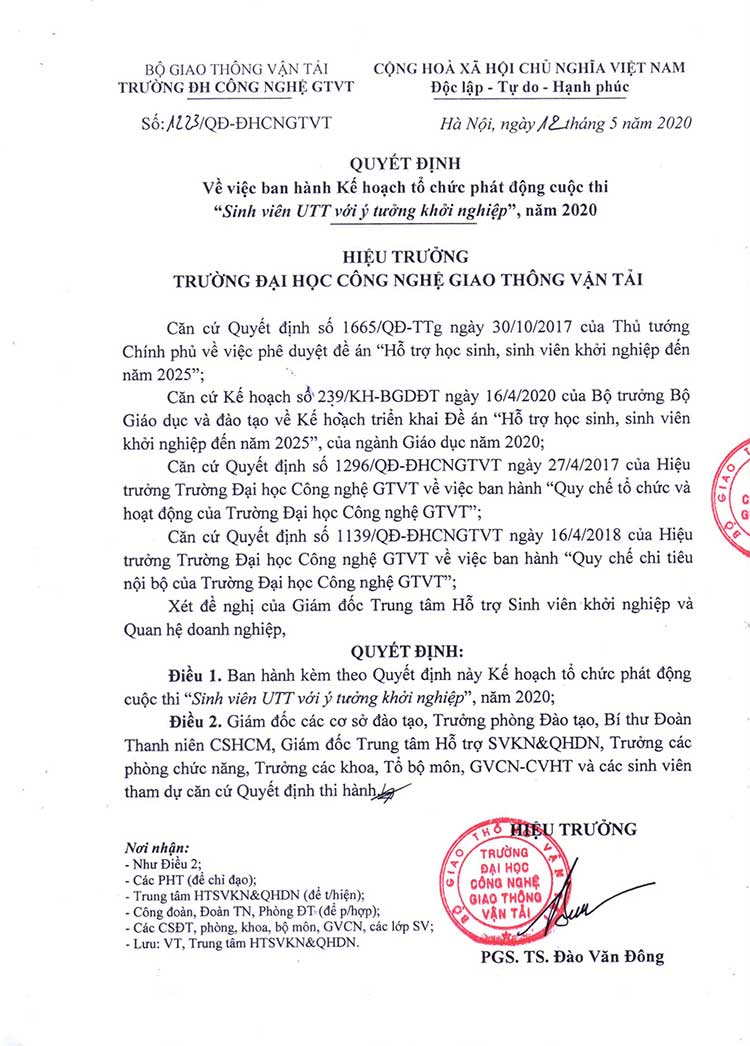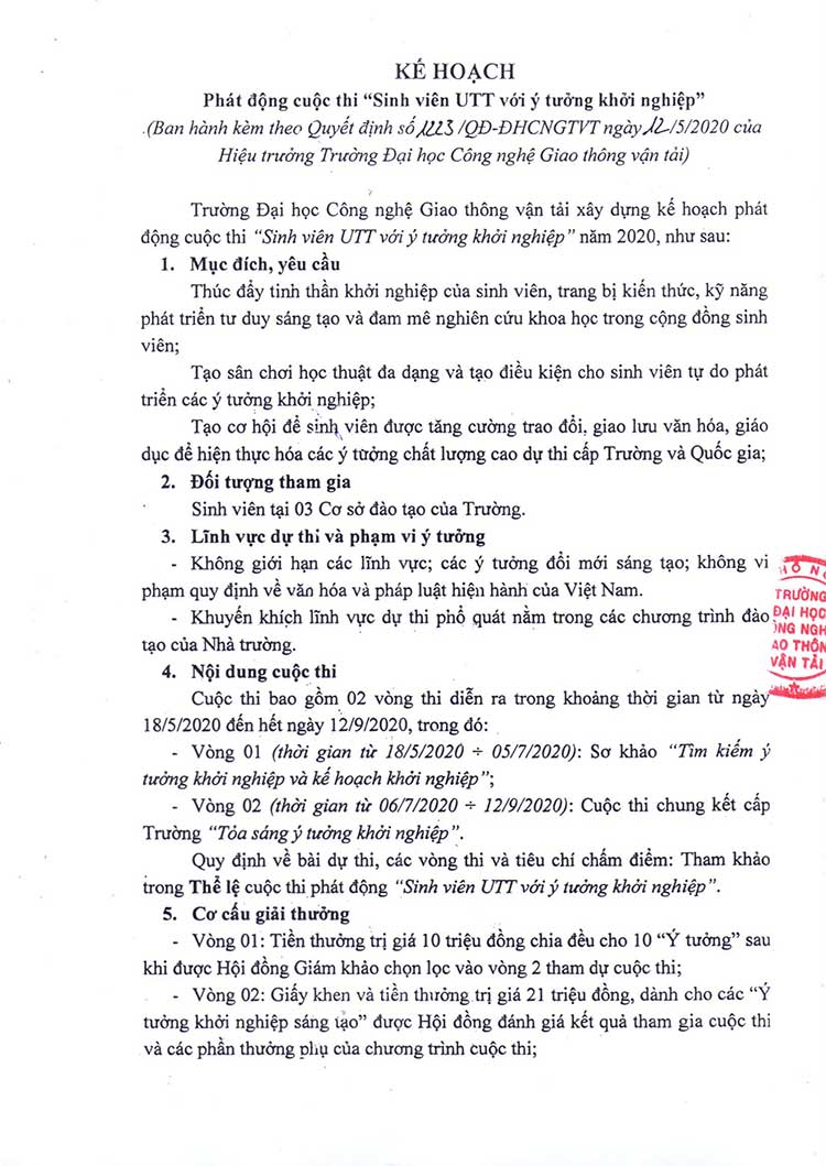 Kế hoạch Phát động cuộc thi Sinh viên UTT với ý tưởng khởi nghiệp 18/05/2020 08:05 File đính kèm the-le-cuoc-thi-khoi-nghiep-2020.pdf the-le-cuoc-thi-sinh-vien-khoi-nghiep-SV-UTT2020.doc Tin liên quan Thông báo về việc cập nhật thông tin Căn cước công dân cho người phụ thuộc 30/10/2025 Kế hoạch tổ chức Toạ đàm khoa học “Vai trò của Trí tuệ nhân tạo và công nghệ mới trong nâng cao hiệu quả nghiên cứu lĩnh vực tài chính kế toán” 24/10/2025 Thông báo về việc cử cán bộ tham gia khóa bồi dưỡng tại Học viện Ngoại giao 20/10/2025 Về việc lấy ý kiến góp ý vào dự thảo Quyết định ban hành Quy định về công tác thi đua, khen thưởng của Trường Đại học Công nghệ GTVT 09/10/2025 Thông báo về việc thống kê khối lượng hoạt động phục vụ cộng đồng của giảng viên năm học 2024-2025 02/10/2025 Kê khai khối lượng hoạt động khoa học và công nghệ phục vụ thanh toán khối lượng thừa giờ năm học 2024-2025 01/10/2025