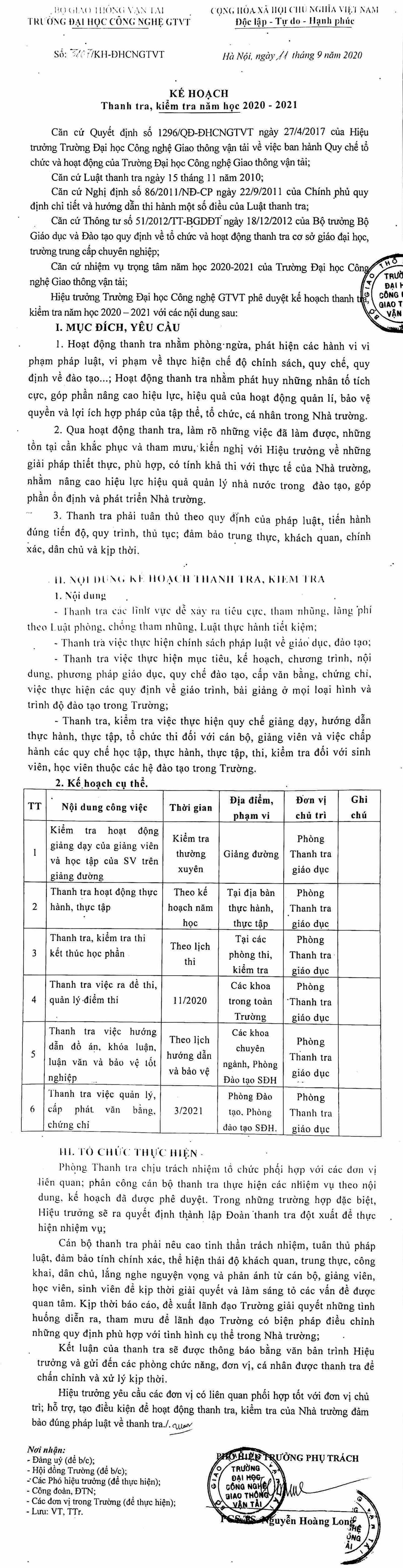 Kế hoạch Thanh tra, kiểm tra năm học 2020-2021