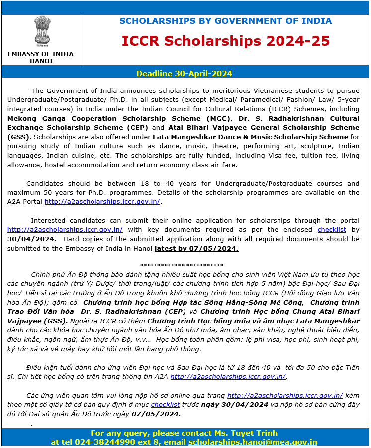 Đại sứ quán kính đề nghị quý Đơn vị giúp chia sẻ thông tin và khuyến khích các ứng viên quan tâm đăng ký các chương trình học bổng ICCR. Hạn chót nhận hồ sơ đăng ký online trên trang http://a2ascholarships.iccr.gov.in/ là 30/04/2024 và hạn chót nhận bản cứng đầy đủ hồ sơ tại Đại sứ quán Ấn Độ là 07/05/2024.