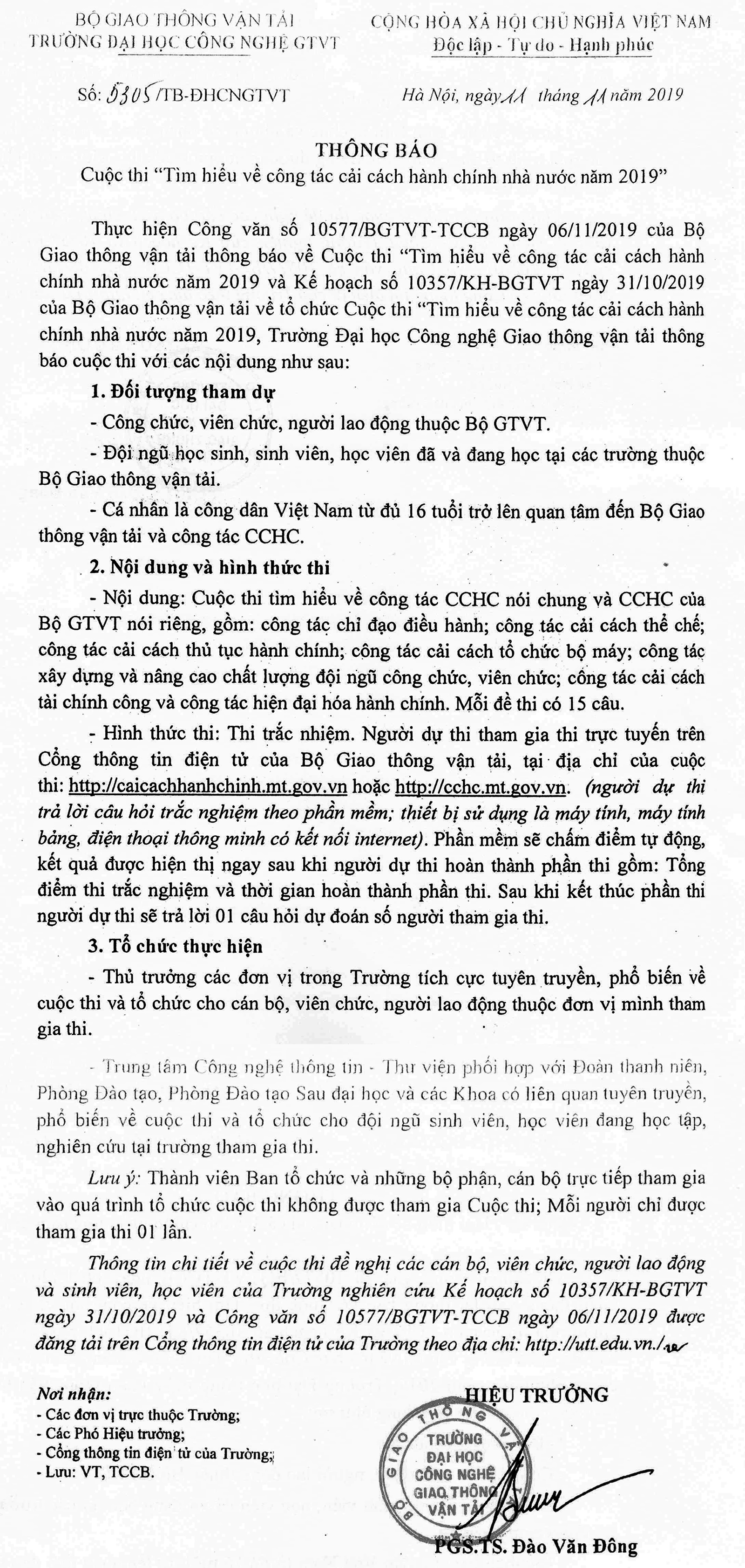 Thông báo Cuộc thi Tìm hiểu về công tác cải cách hành chính nhà nước năm 2019 12/11/2019 02:11 File đính kèm 5305.pdf 10357.pdf 10577.pdf Tin liên quan Kế hoạch tổ chức Toạ đàm khoa học “Vai trò của Trí tuệ nhân tạo và công nghệ mới trong nâng cao hiệu quả nghiên cứu lĩnh vực tài chính kế toán” 24/10/2025 Thông báo về việc cử cán bộ tham gia khóa bồi dưỡng tại Học viện Ngoại giao 20/10/2025 Về việc lấy ý kiến góp ý vào dự thảo Quyết định ban hành Quy định về công tác thi đua, khen thưởng của Trường Đại học Công nghệ GTVT 09/10/2025 Thông báo về việc thống kê khối lượng hoạt động phục vụ cộng đồng của giảng viên năm học 2024-2025 02/10/2025 Kê khai khối lượng hoạt động khoa học và công nghệ phục vụ thanh toán khối lượng thừa giờ năm học 2024-2025 01/10/2025 Tổ chức lớp bồi dưỡng nghiệp vụ sư phạm và bồi dưỡng tiêu chuẩn chức danh nghề nghiệp giảng viên đại học 01/10/2025