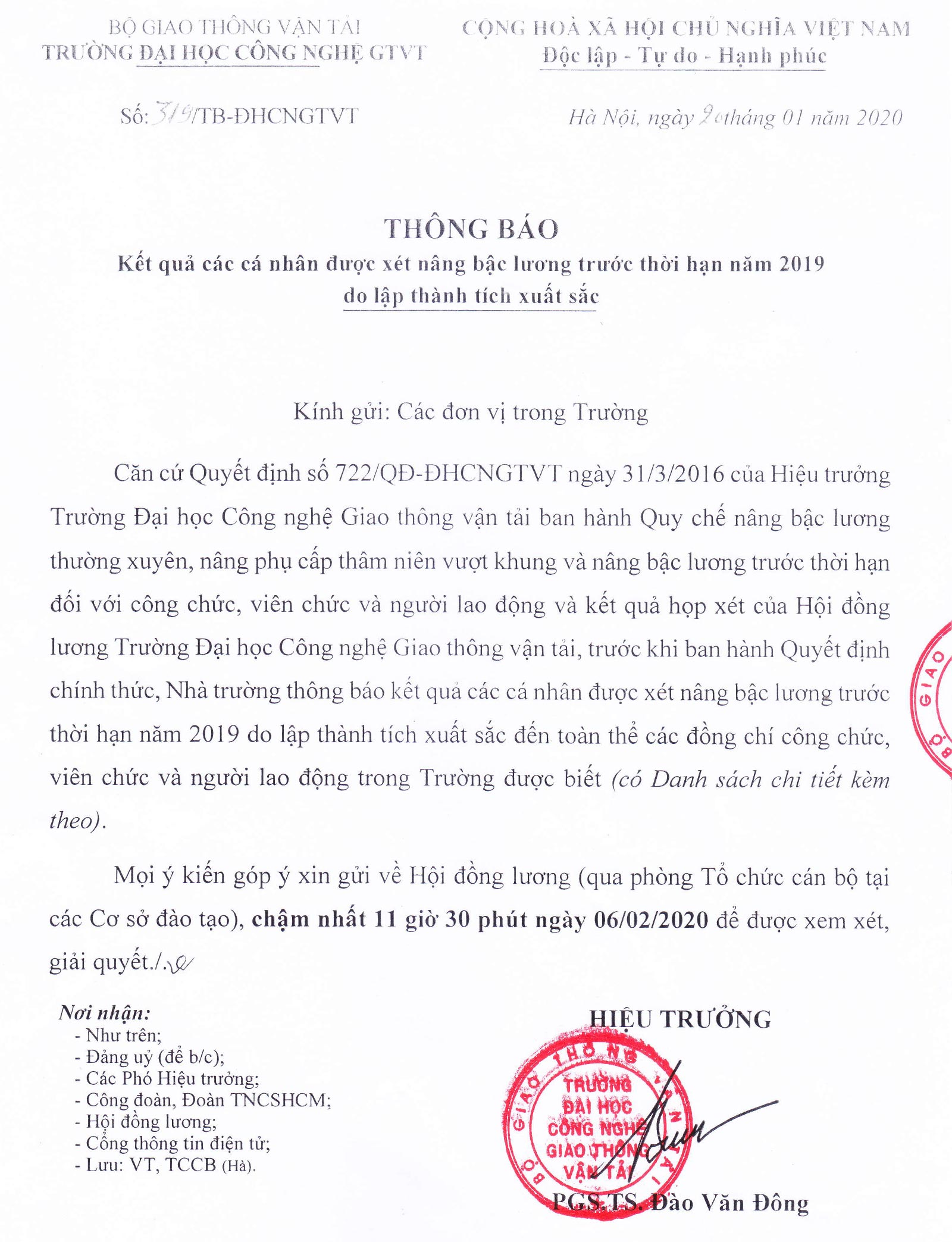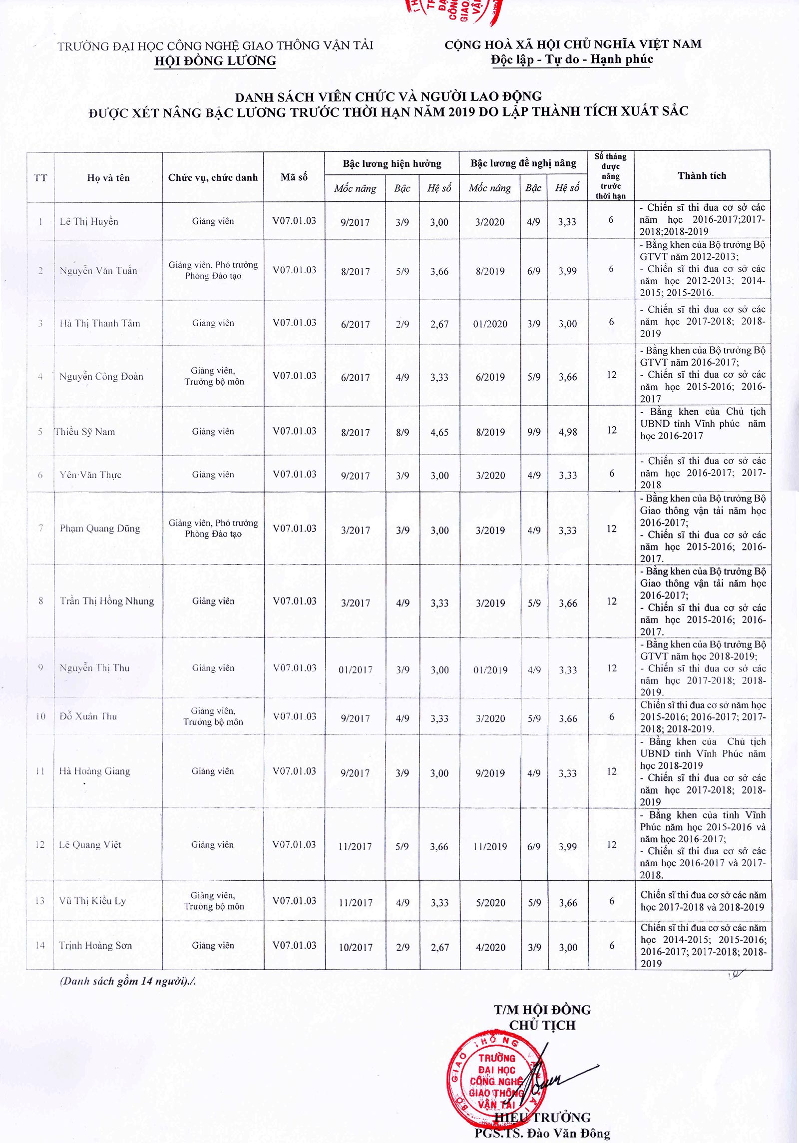 Thông báo Kết quả các cá nhân được xét nâng bậc lương trước thời hạn năm 2019 do lập thành tích xuất sắc 21/01/2020 04:01
