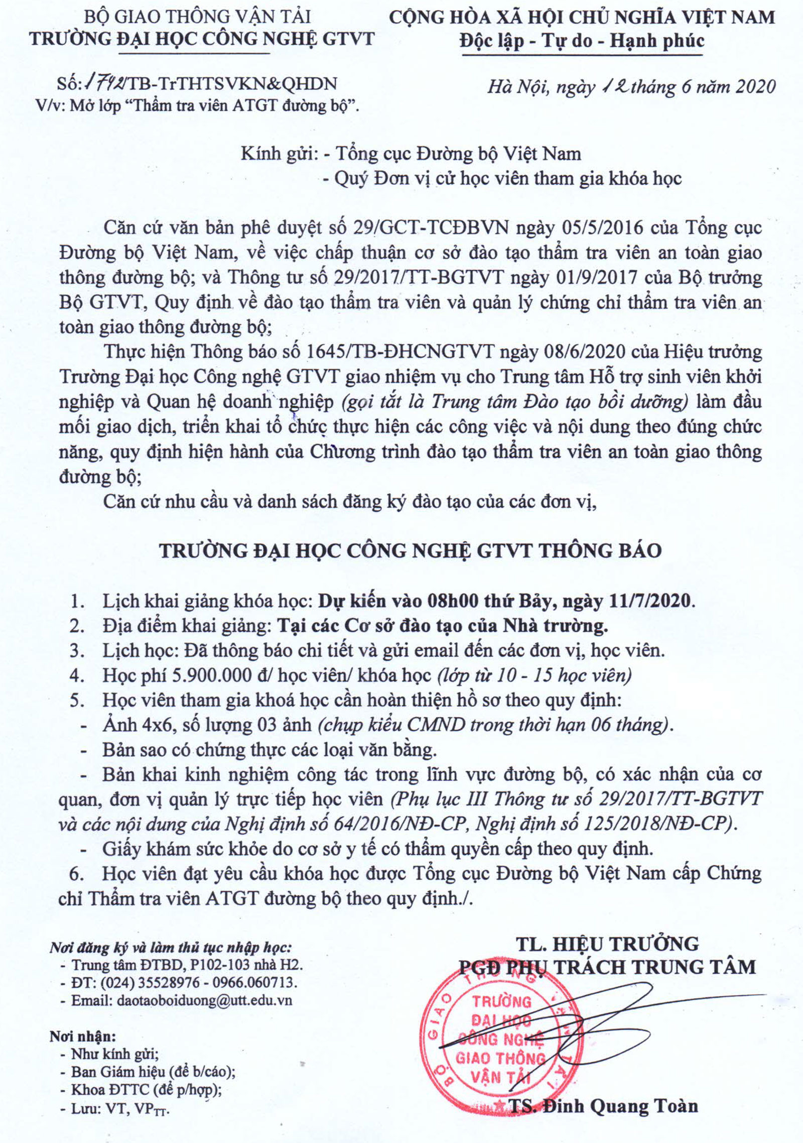 Thông báo Mở lớp Thẩm tra viên An toàn giao thông đường bộ 01/07/2020 11:07 File đính kèm ND125-CP2018-sua-doi-ND64_CSDT-tham-tra-vien-ATGT.pdf ND64.2016.ND-CP-01.7.2016.pdf TB1645-mo-lop-Tham-tra-vien-ATGT2020.pdf TT29-BGTVT2017-Ttra-vien-ATGT--kem-mau-ho-so-.doc Thong-bao-mo-lop-Tham-tra-vien-ATGT-11.7.20.pdf Tin liên quan Kế hoạch tổ chức Toạ đàm khoa học “Vai trò của Trí tuệ nhân tạo và công nghệ mới trong nâng cao hiệu quả nghiên cứu lĩnh vực tài chính kế toán” 24/10/2025 Thông báo về việc cử cán bộ tham gia khóa bồi dưỡng tại Học viện Ngoại giao 20/10/2025 Về việc lấy ý kiến góp ý vào dự thảo Quyết định ban hành Quy định về công tác thi đua, khen thưởng của Trường Đại học Công nghệ GTVT 09/10/2025 Thông báo về việc thống kê khối lượng hoạt động phục vụ cộng đồng của giảng viên năm học 2024-2025 02/10/2025 Kê khai khối lượng hoạt động khoa học và công nghệ phục vụ thanh toán khối lượng thừa giờ năm học 2024-2025 01/10/2025 Tổ chức lớp bồi dưỡng nghiệp vụ sư phạm và bồi dưỡng tiêu chuẩn chức danh nghề nghiệp giảng viên đại học 01/10/2025 Tin nổi bật UTT ra mắt Mạng lưới trung tâm đào tạo xuất sắc và tài năng trong lĩnh vực Công nghệ giao thông và Hạ tầng tiên... 10/10/2025 13:10 Thông tin mới nhất Người thầy lặng lẽ gieo hạt tri thức và lan tỏa giá trị khoa học Việt Nam 27/10/2025 10:10 Kế hoạch tổ chức Toạ đàm khoa học “Vai trò của Trí tuệ nhân tạo và công nghệ mới trong nâng cao hiệu quả nghiên... 24/10/2025 14:10 Thông báo về việc cử cán bộ tham gia khóa bồi dưỡng tại Học viện Ngoại giao 20/10/2025 15:10 Lễ ký kết hợp tác đào tạo Chương trình liên kết 2 + 2 giữa UTT và Trường Đại học Giao thông Quốc gia Hàn Quốc... 20/10/2025 10:10 Hội thảo Quốc tế về Đường sắt tốc độ cao ICHSR năm 2025 17/10/2025 14:10