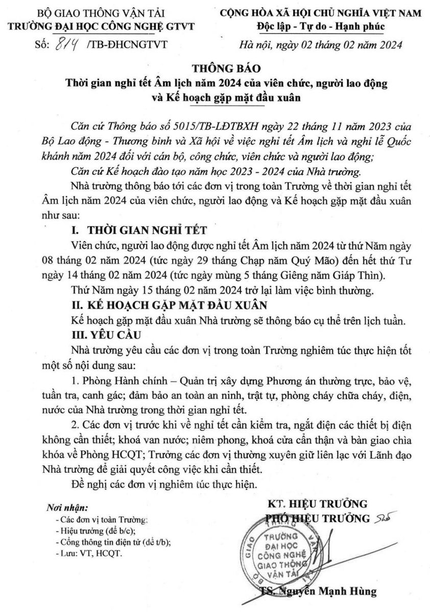 Thông báo thời gian nghỉ tết Âm lịch năm 2024 của viên chức, người lao động và Kế hoạch gặp mặt đầu xuân 02/02/2024 16:02