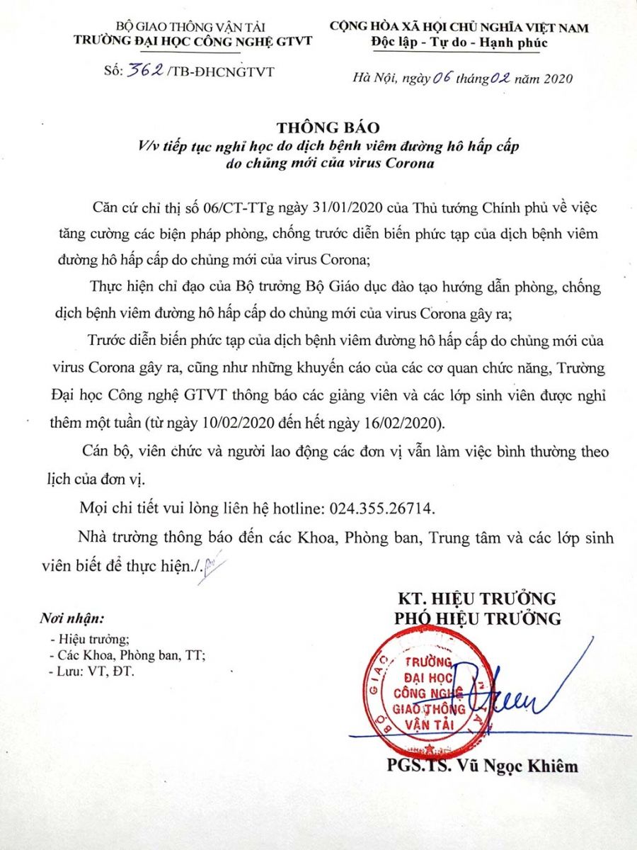 Thông báo tiếp tục nghỉ học do dịch bệnh viêm đường hô hấp cấp do chủng mới của virus Corona 06/02/2020 08:02