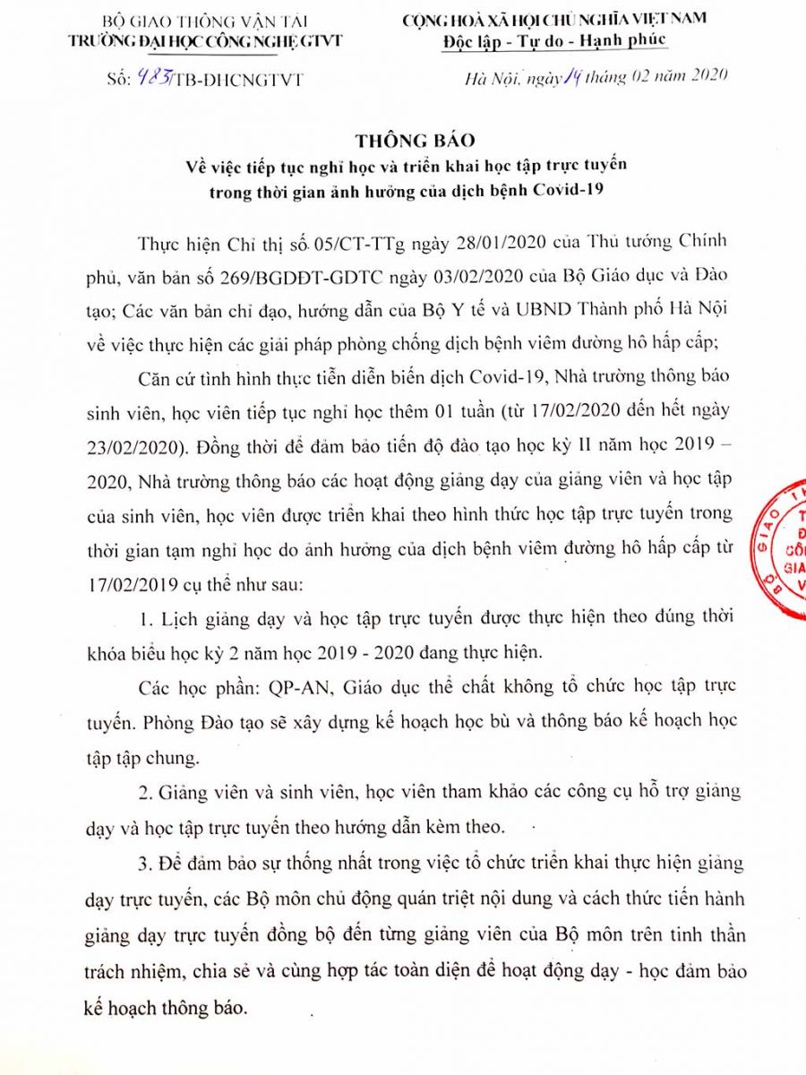 Thông báo tiếp tục nghỉ học và triển khai học tập trực tuyến trong thời gian ảnh hưởng của dịch bệnh Covid-19 14/02/2020 08:02 File đính kèm Huong-dan-giang-day-va-hoc-tap-truc-tuyen.pdf