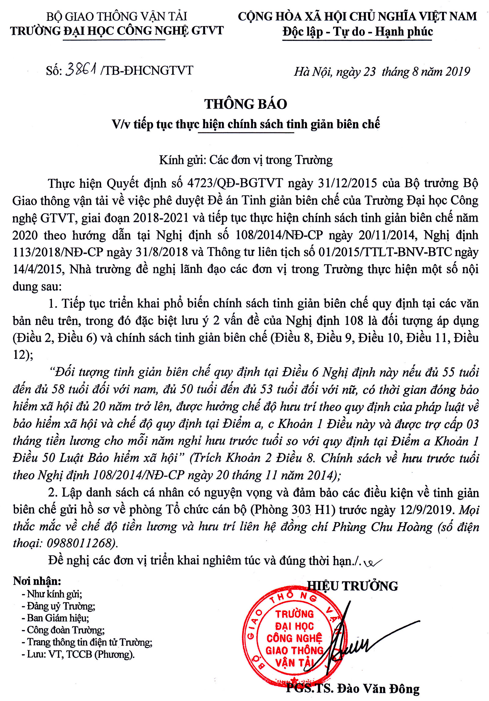 Thông báo tiếp tục thực hiện chính sách tinh giản biên chế 23/08/2019 17:08 File đính kèm 113.2018.NA_-CP.doc 108.2014.ND.CP.doc Mau-don.doc 01-TTLT-BNV.signed.pdf mau-danh-sach-de-nghi-tinh-gian-bien-che.xls Tin liên quan Thông báo về việc cập nhật thông tin Căn cước công dân cho người phụ thuộc 30/10/2025 Kế hoạch tổ chức Toạ đàm khoa học “Vai trò của Trí tuệ nhân tạo và công nghệ mới trong nâng cao hiệu quả nghiên cứu lĩnh vực tài chính kế toán” 24/10/2025 Thông báo về việc cử cán bộ tham gia khóa bồi dưỡng tại Học viện Ngoại giao 20/10/2025 Về việc lấy ý kiến góp ý vào dự thảo Quyết định ban hành Quy định về công tác thi đua, khen thưởng của Trường Đại học Công nghệ GTVT 09/10/2025 Thông báo về việc thống kê khối lượng hoạt động phục vụ cộng đồng của giảng viên năm học 2024-2025 02/10/2025 Kê khai khối lượng hoạt động khoa học và công nghệ phục vụ thanh toán khối lượng thừa giờ năm học 2024-2025 01/10/2025 Tin nổi bật UTT Awards 2025: Khi người học nói lời tri ân những người Tận tâm- Tận hiến vì UTT 29/10/2025 14:10 UTT ra mắt Mạng lưới trung tâm đào tạo xuất sắc và tài năng trong lĩnh vực Công nghệ giao thông và Hạ tầng tiên... 10/10/2025 13:10 Thông tin mới nhất UTT thúc đẩy hợp tác với các đối tác Úc trong đào tạo, nghiên cứu và hỗ trợ sinh viên 30/10/2025 15:10 Thông báo về việc cập nhật thông tin Căn cước công dân cho người phụ thuộc 30/10/2025 15:10 UTT Awards 2025: Khi người học nói lời tri ân những người Tận tâm- Tận hiến vì UTT 29/10/2025 14:10 Cuộc thi Ngọn lửa hùng biện - Kết nối tri thức & nâng cao năng lực hùng biện của sinh viên UTT 28/10/2025 15:10 Người thầy lặng lẽ gieo hạt tri thức và lan tỏa giá trị khoa học Việt Nam 27/10/2025 10:10