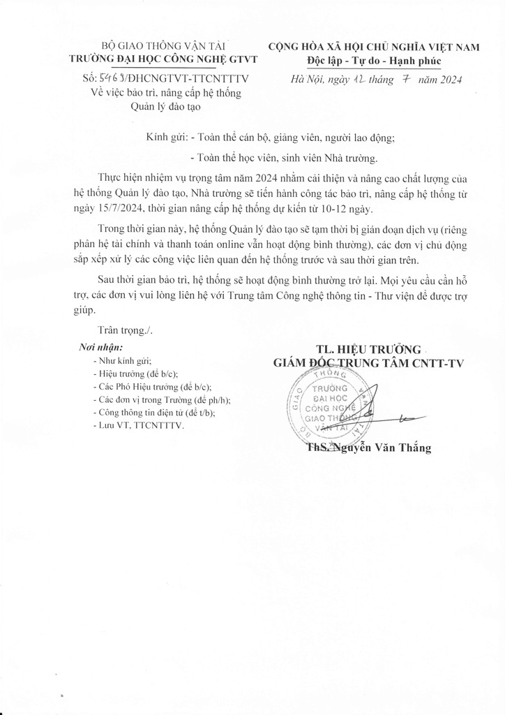 Thông báo về việc bảo trì, nâng cấp hệ thống Quản lý đào tạo